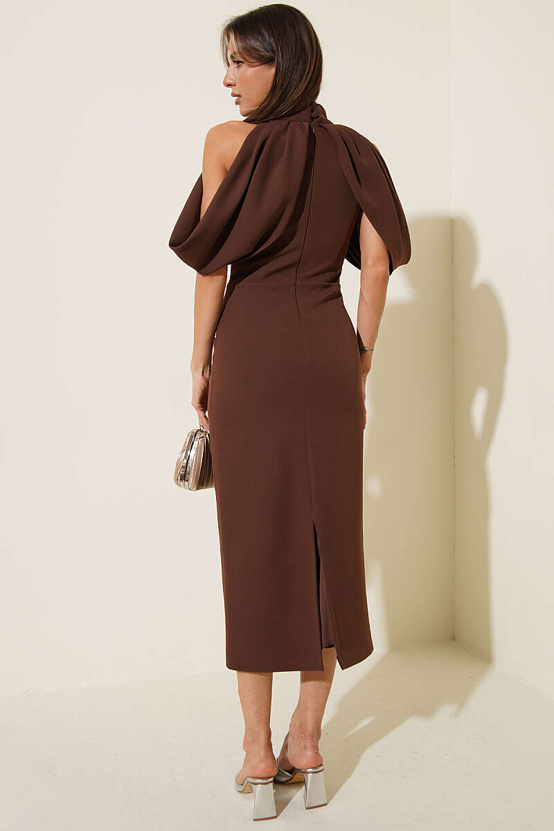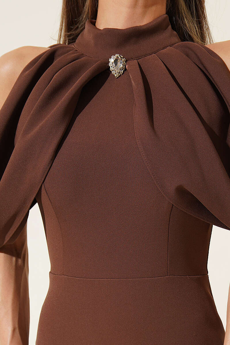 Dik Yaka Pelerin Detaylı Abiye Elbise Kahve