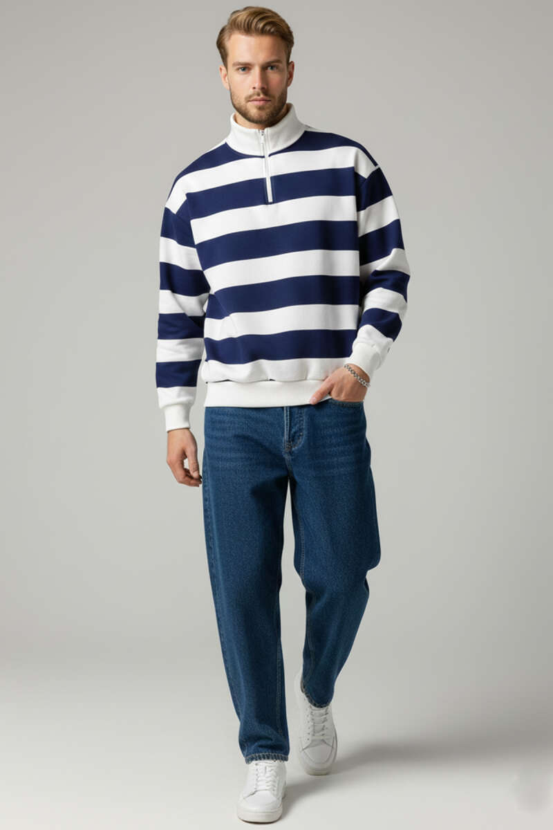 Dik Yaka Şeritli Erkek Sweatshirt Lacivert