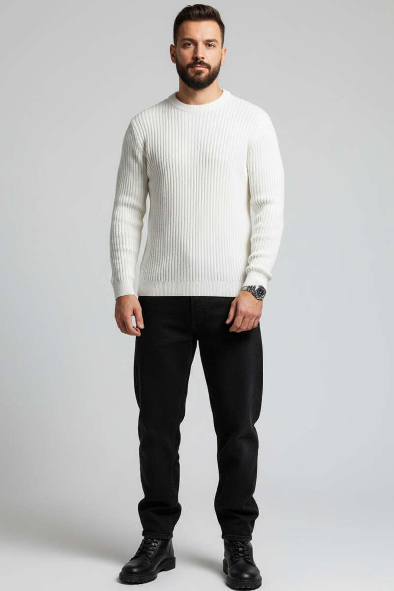 Dikey Çizgi Fitilli Erkek Triko Kazak Taş