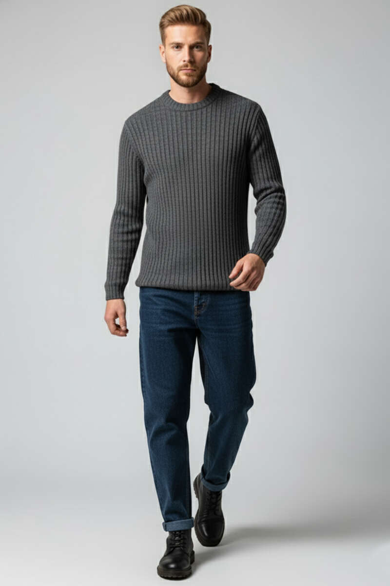 Dikey Çizgi Fitilli Erkek Triko Kazak Taş