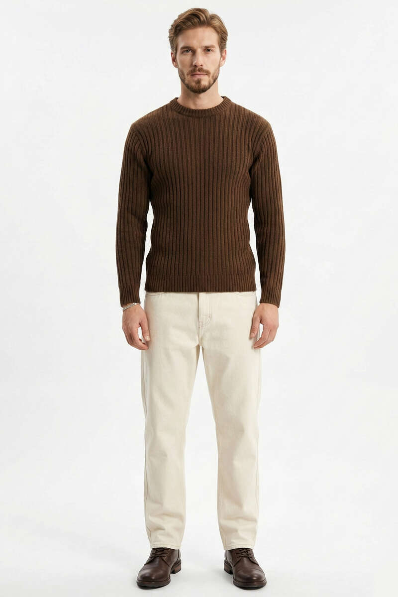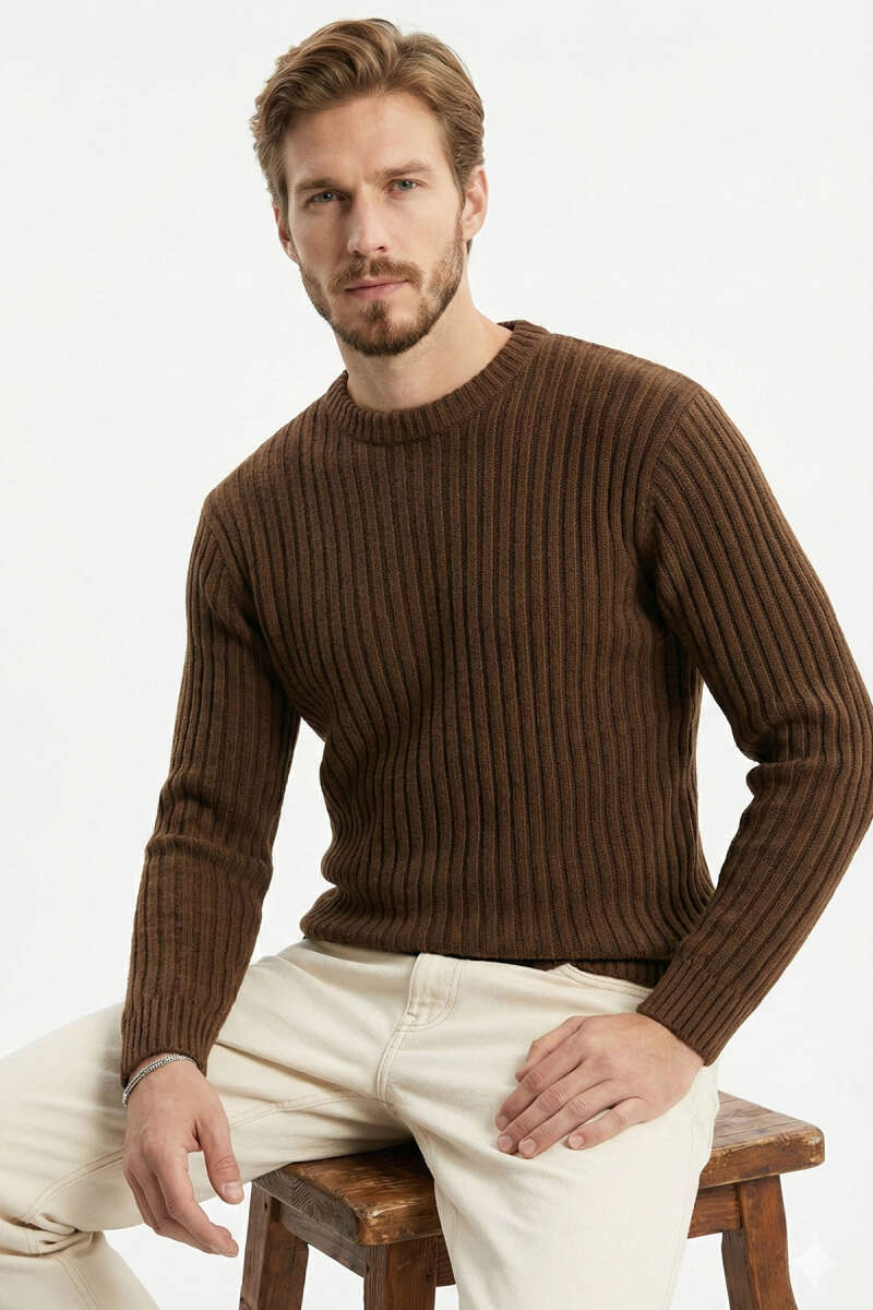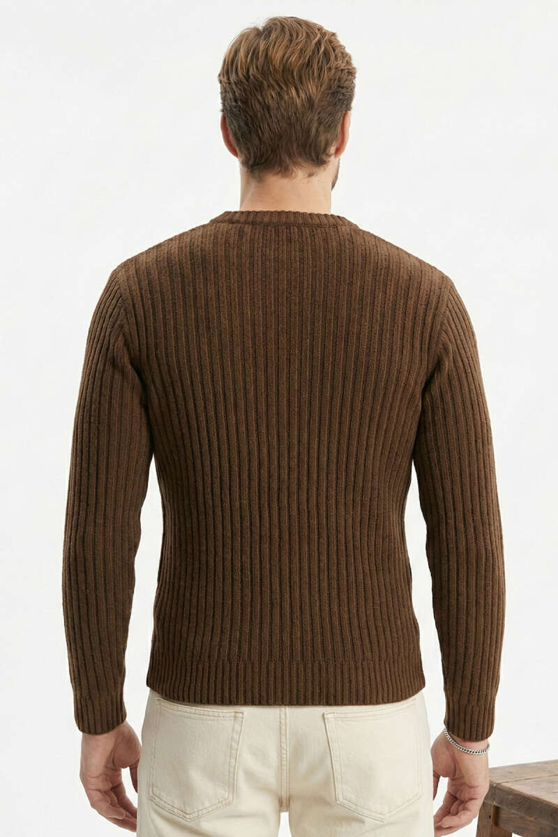 Dikey Çizgi Fitilli Erkek Triko Kazak Kahve