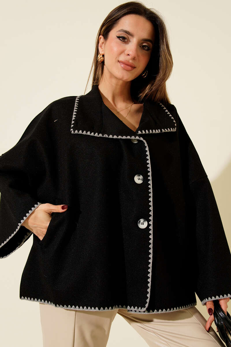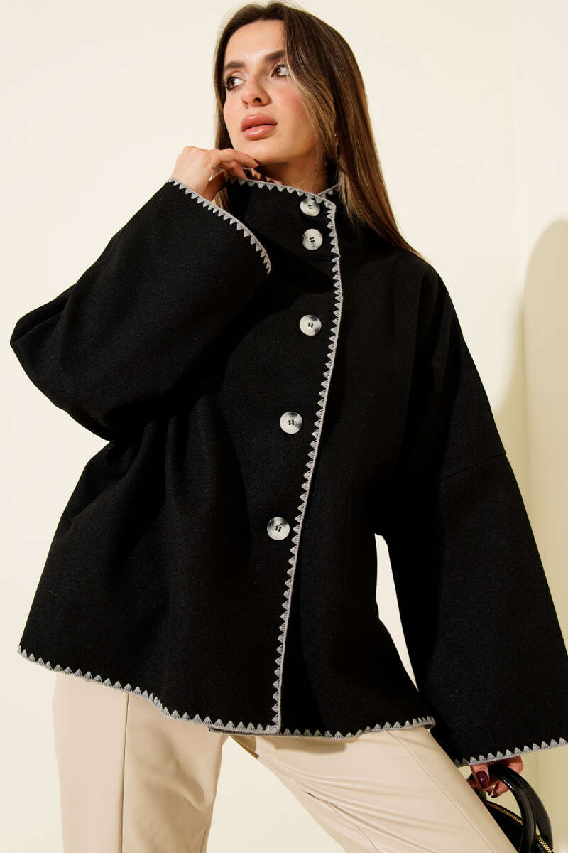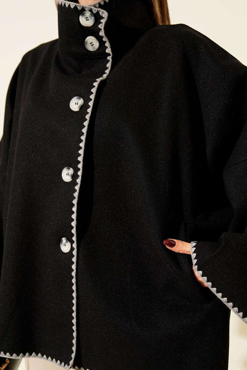 Dikiş Detaylı Düğmeli Kaşe Panço Bej