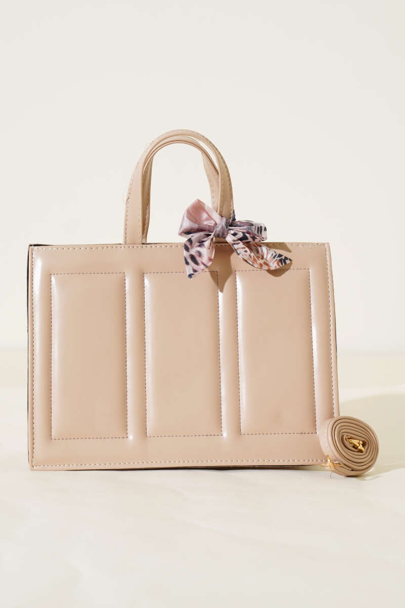 Şeritli Ayıcık Aksesuarlı Omuz Çantası Vizon