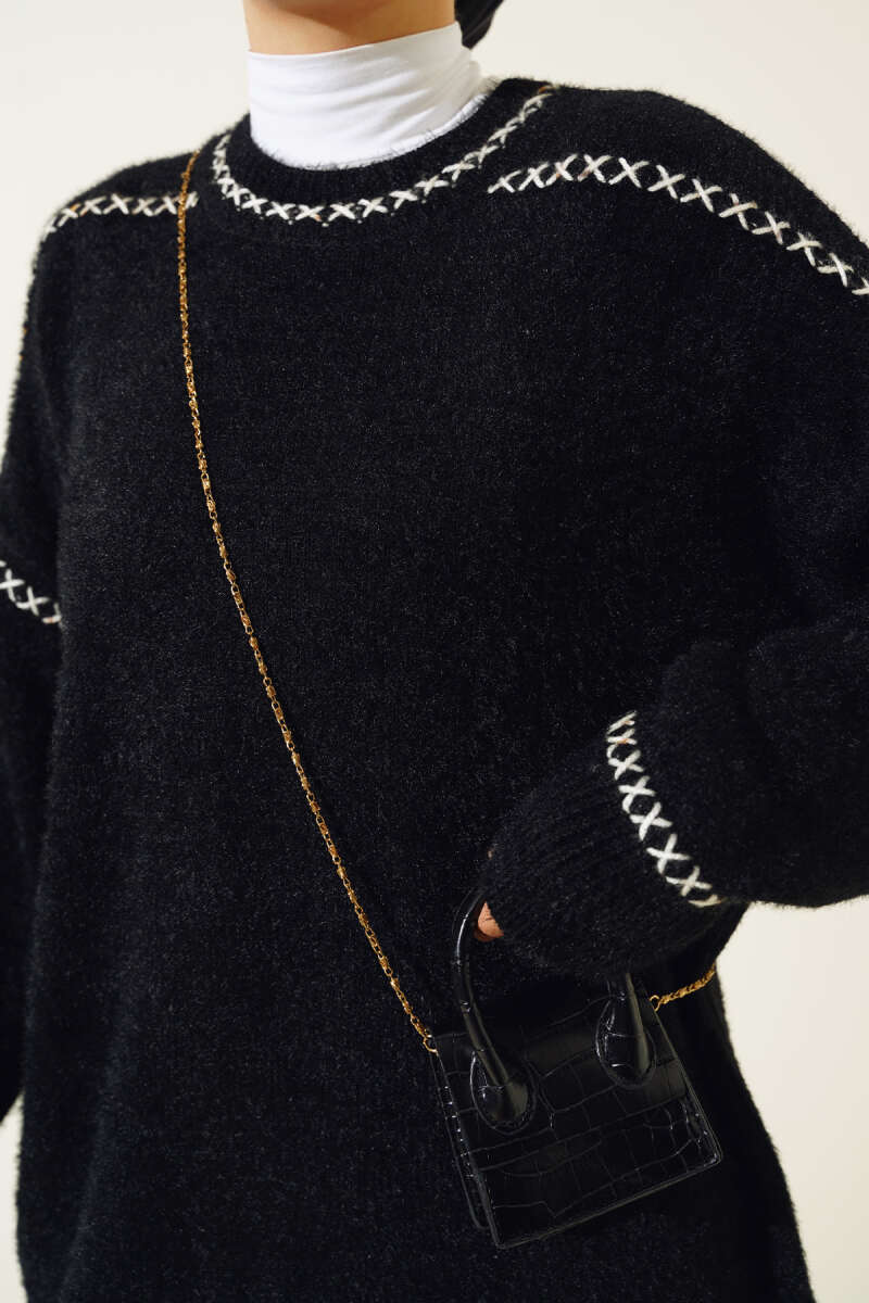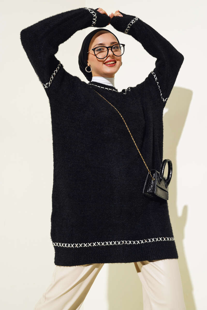 Bisiklet Yaka Yan Şeritli Triko Tunik Lacivert