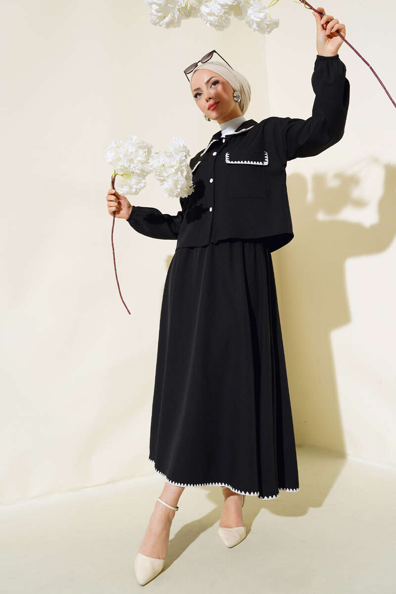 Yeni sezon ikili takım modelimiz sizlerle beraber. Ceketimizin yakası ve cep kapağı dikiş detaylıdır. Ceketimizin iki adet cebi vardır. Ceketimizin kol bilekleri lastiklidir. Ceketimizin önü düğmelidir. Eteğimizin beli lastiklidir. Eteğimizin ucu dikiş detaylıdır. Renk seçeneklerimiz mevcuttur. Dolabınızdaki yerini bekliyor.