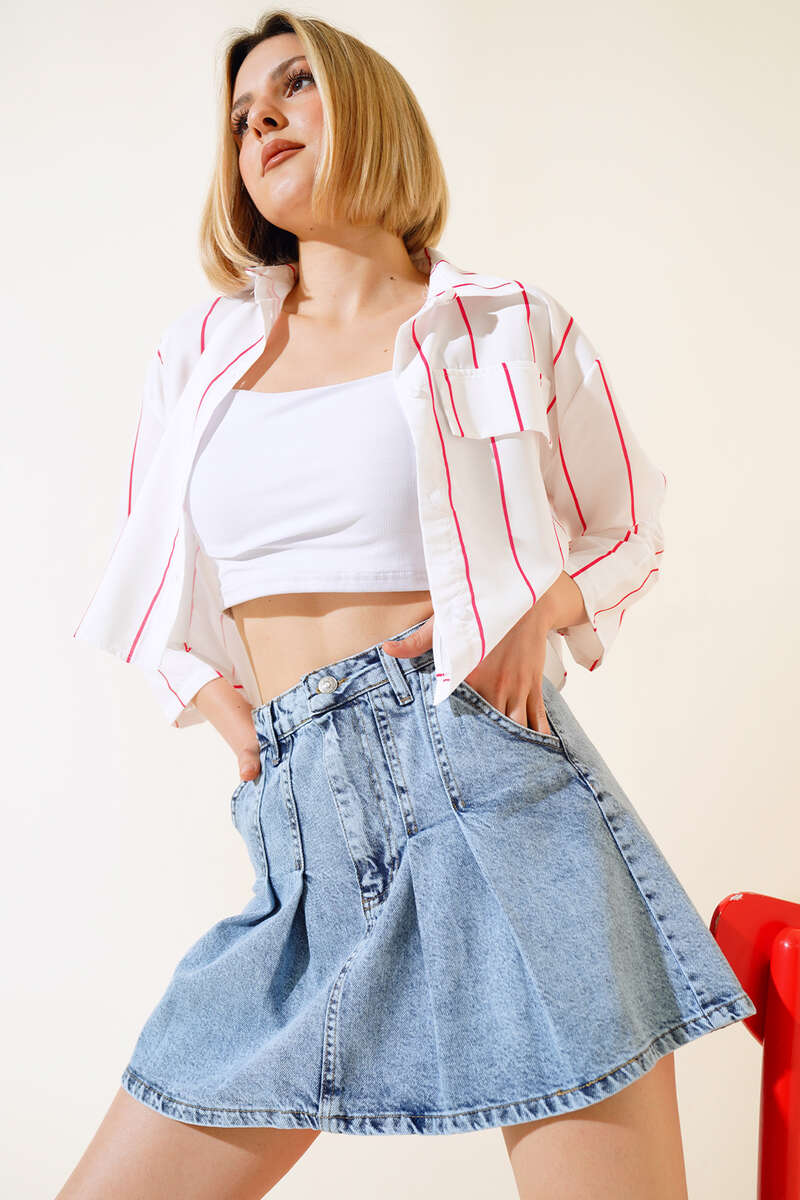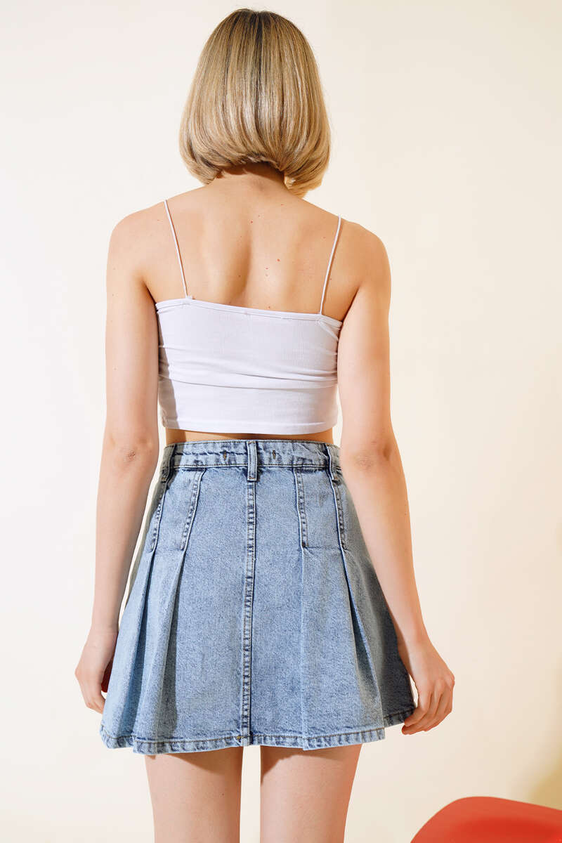 Yeni sezon eteğimiz sizlerle beraber. Eteğimizin beli düğmeli ve fermuarlıdır. Beş adet kemer köprüsü vardır. Astarsızdır. Eteğimiz mini modeldir. İki adet cebi vardır. Şık ve sportif eteğimiz dolabınızdaki yerini beklemektedir.