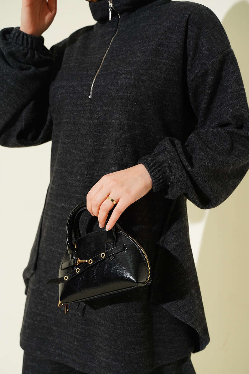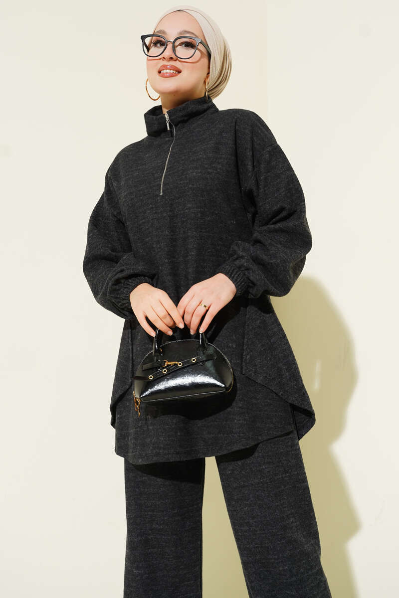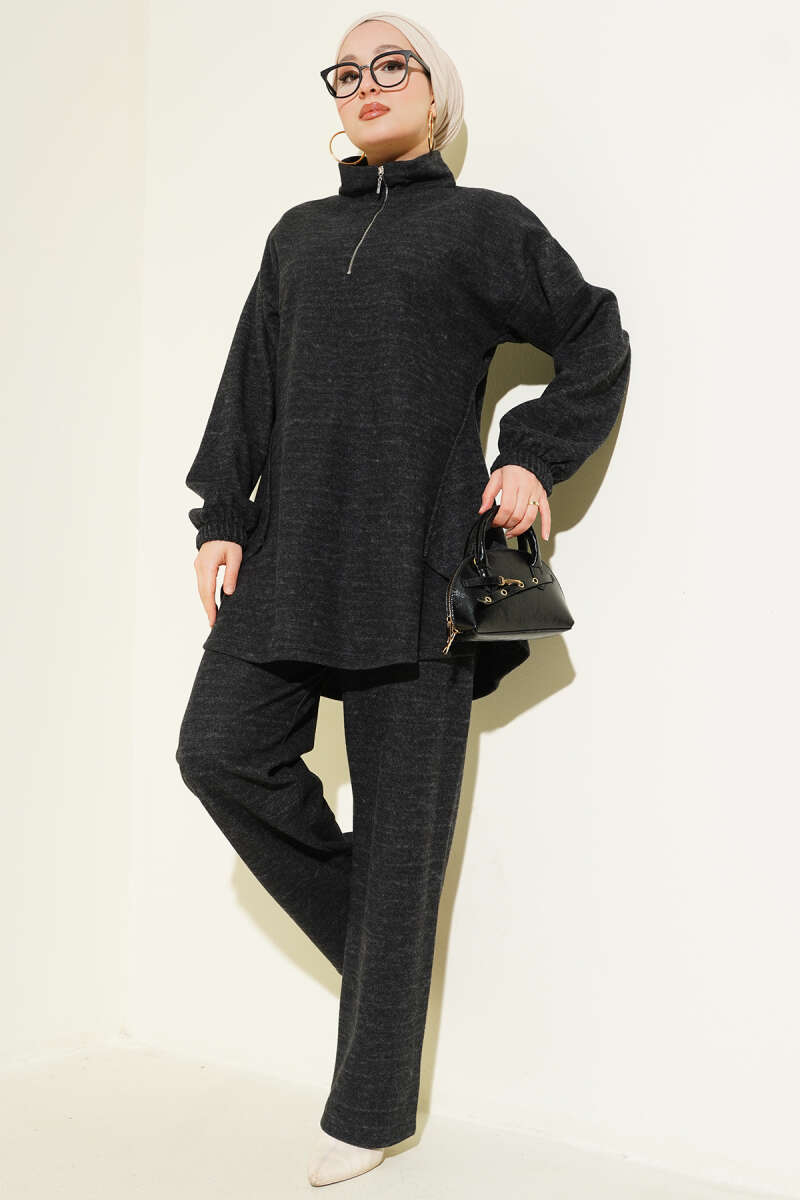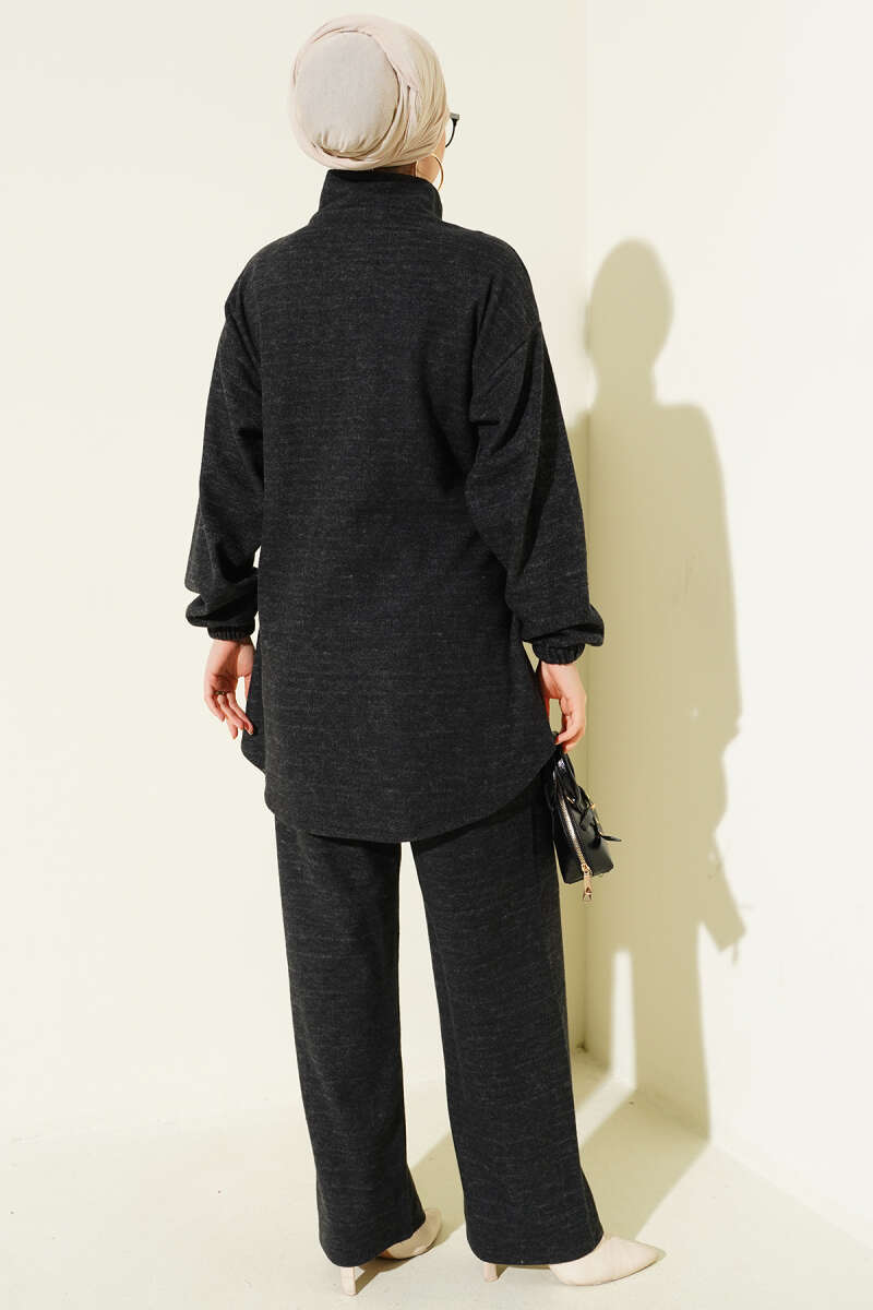 Dikişli Yarım Fermuarlı Kaşe İkili Takım Füme