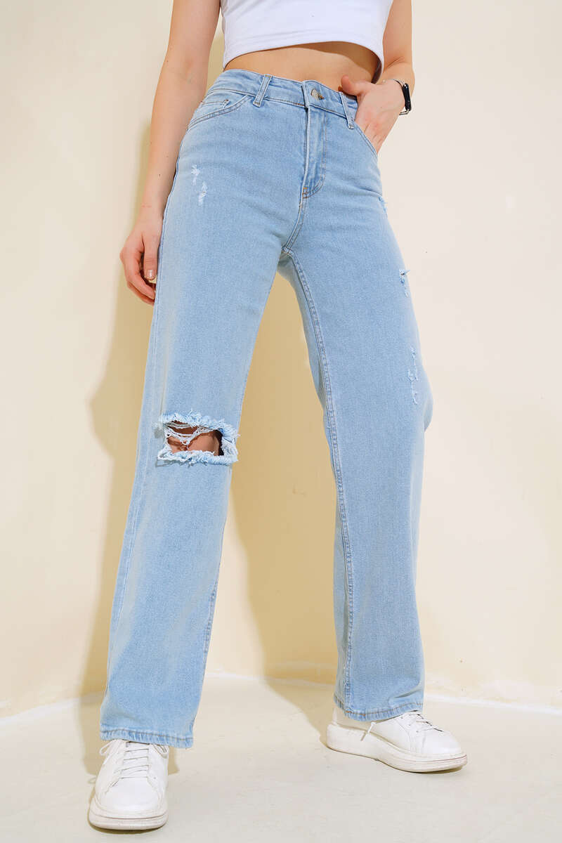 Yeni sezon pantolon modelimiz sizlerle beraber. Yüksek bel pantolonumuzun dört adet cebi bulunmaktadır. Bol paça modeldir.  Dizi yırtık modeldir.  Belinde kemer köprüleri vardır. Fermuarlı ve düğmelidir. Kombinleriniz vazgeçilmez parçası olacak pantolonumuz gardıroplarınızda yerini beklemektedir.