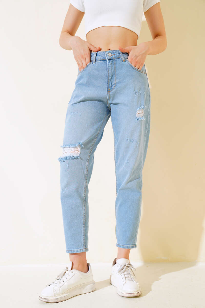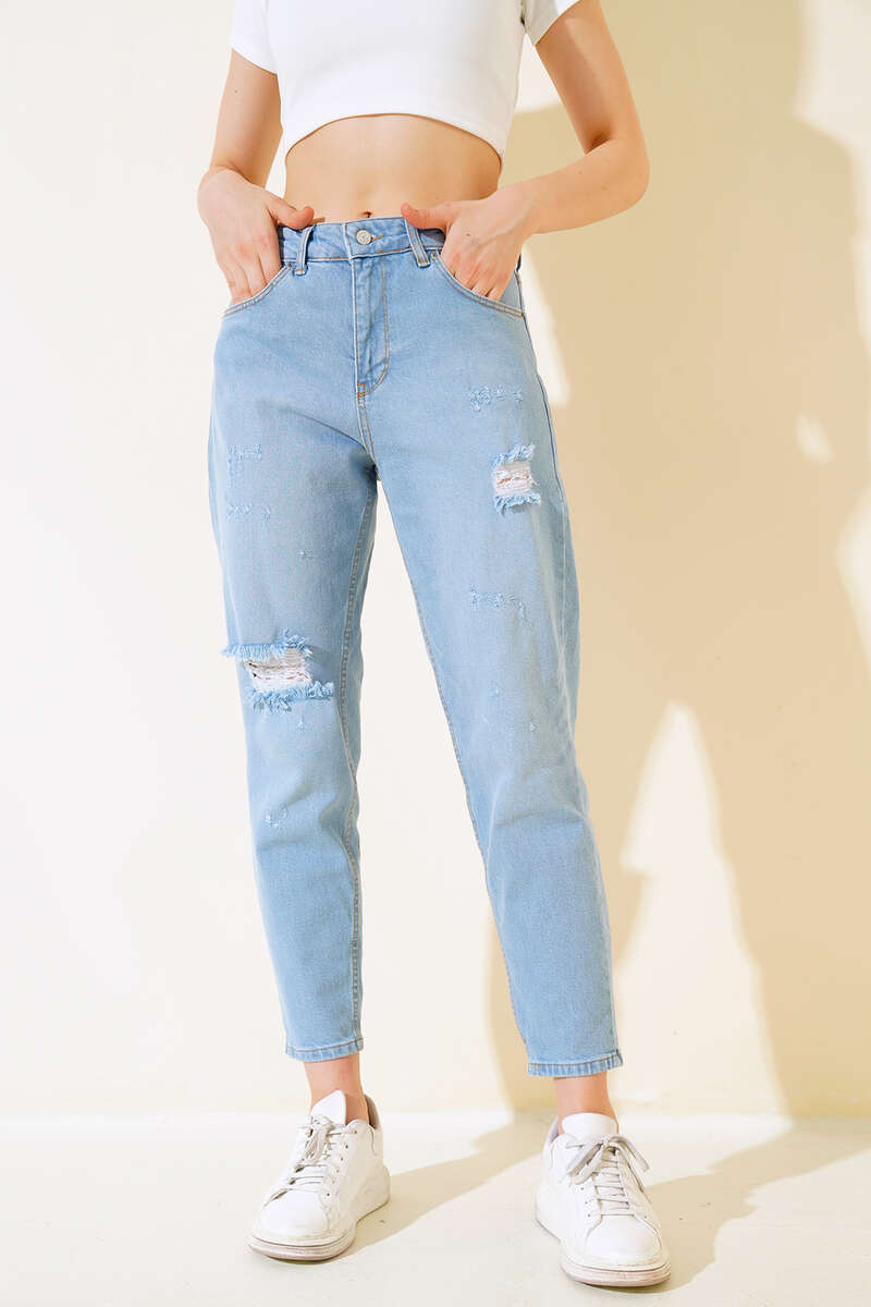 Yeni sezon pantolon modelimiz sizlerle beraber. Pantolonumuzun dizi yırtık detaylıdır. Beli düğmeli ve fermuarlıdır. İki önde iki arka cebi vardır. Dar paça modeldir. Pantolonumuzun belinde beş adet kemer köprüsü vardır. Sportif ve şık pantolonumuz sizlerle beraber.