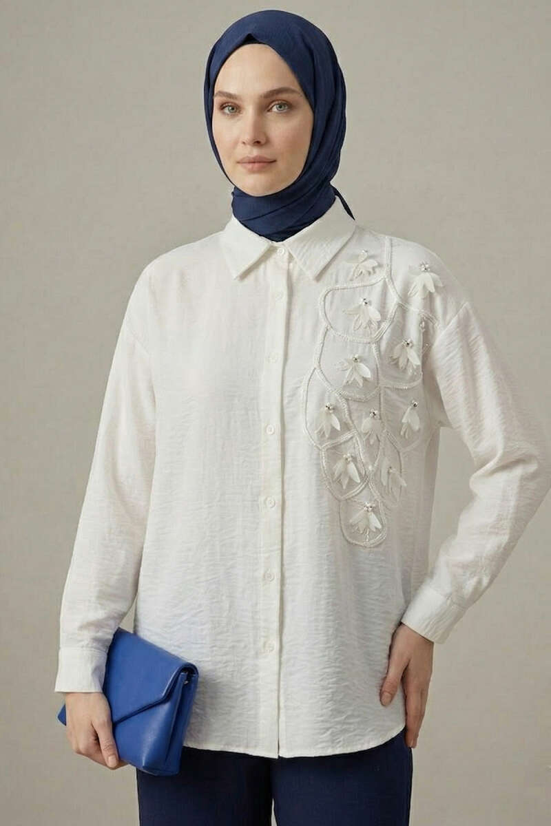 3D Çiçek Aplikeli Gömlek Ekru