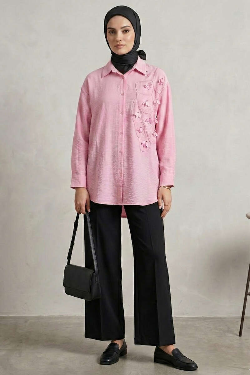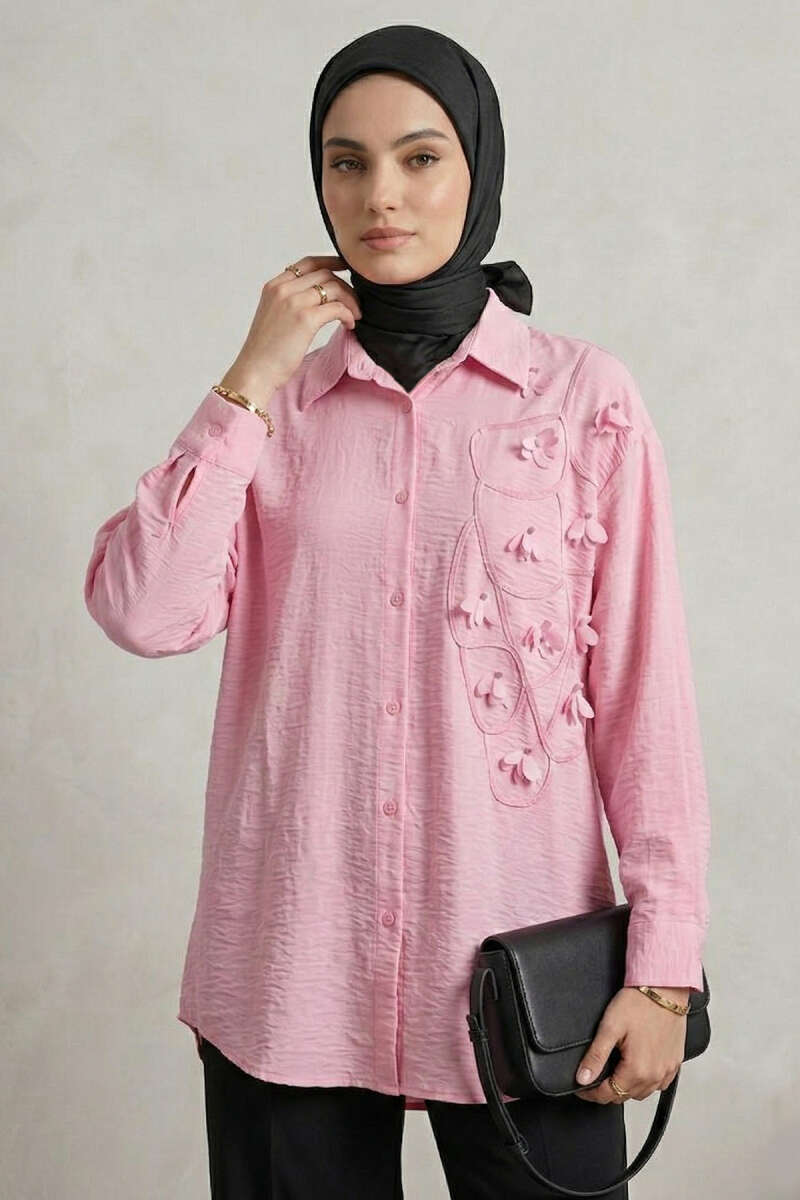 Zarafetin Modern Dokunuşu Gardırobunuzun en özel parçası olmaya aday bu gömlek, sofistike detayları ve konforlu kesimiyle stilinizi bir üst seviyeye taşıyor. Krep dokusunun verdiği asalet, ön paneldeki el işçiliği görünümlü 3D çiçek aplikleri ve bu apliklerin merkezindeki kristal taş detaylarıyla birleşerek göz alıcı bir şıklık sunuyor.
