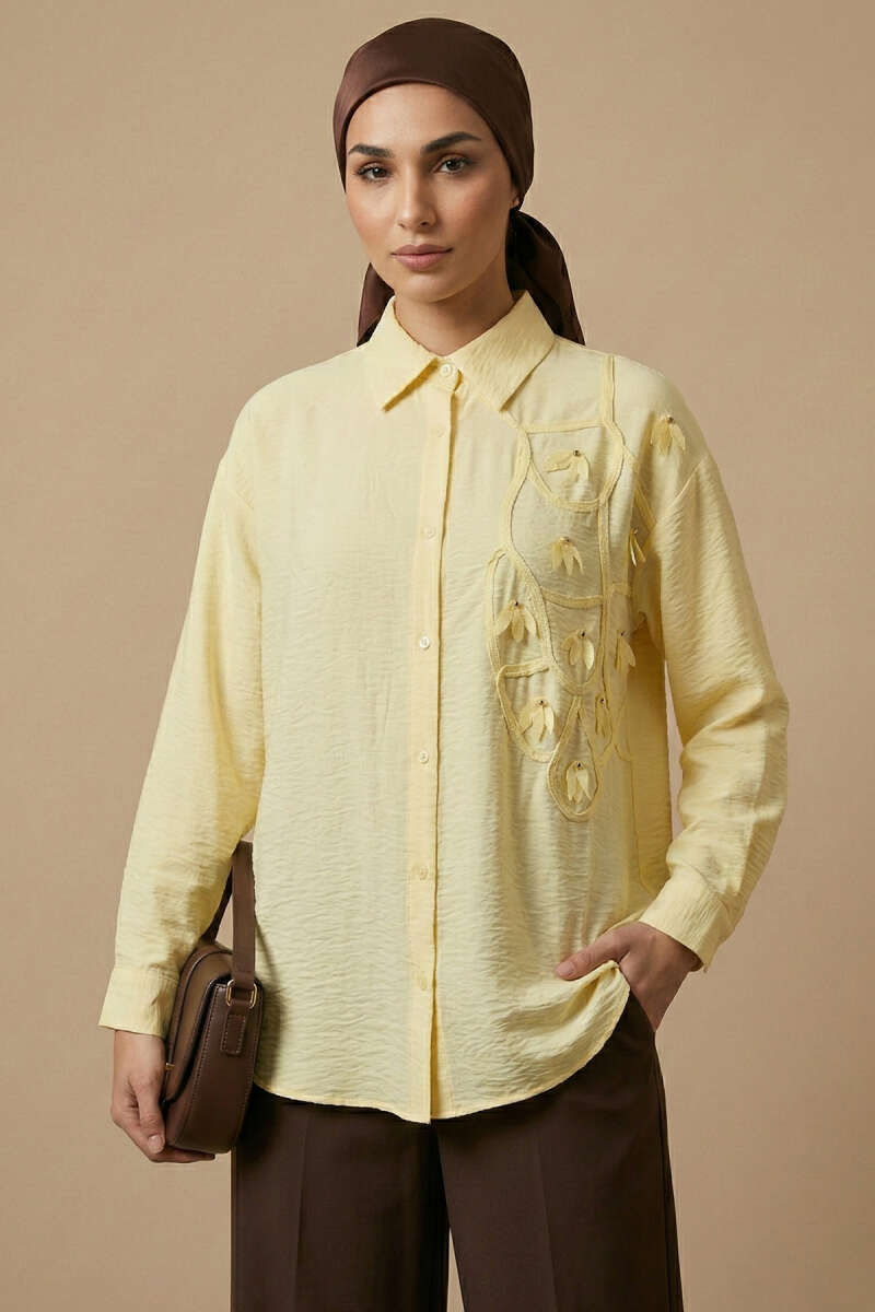 Zarafetin Modern Dokunuşu Gardırobunuzun en özel parçası olmaya aday bu gömlek, sofistike detayları ve konforlu kesimiyle stilinizi bir üst seviyeye taşıyor. Krep dokusunun verdiği asalet, ön paneldeki el işçiliği görünümlü 3D çiçek aplikleri ve bu apliklerin merkezindeki kristal taş detaylarıyla birleşerek göz alıcı bir şıklık sunuyor.