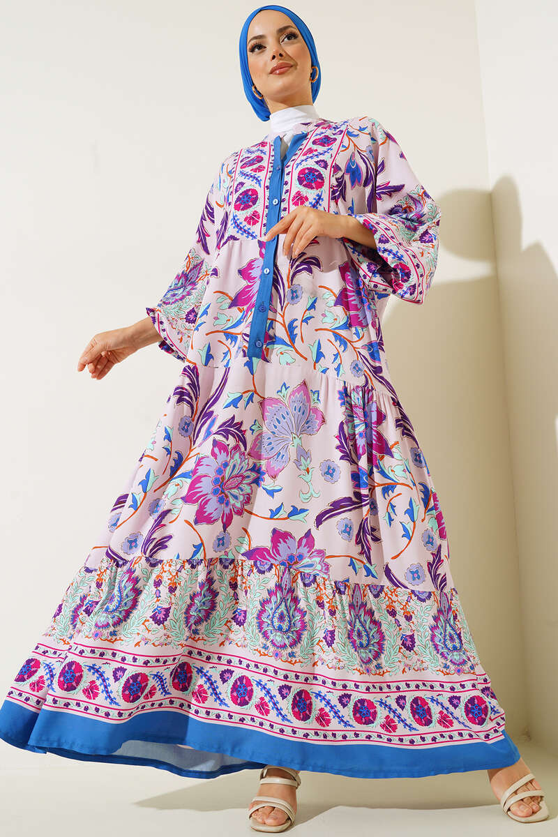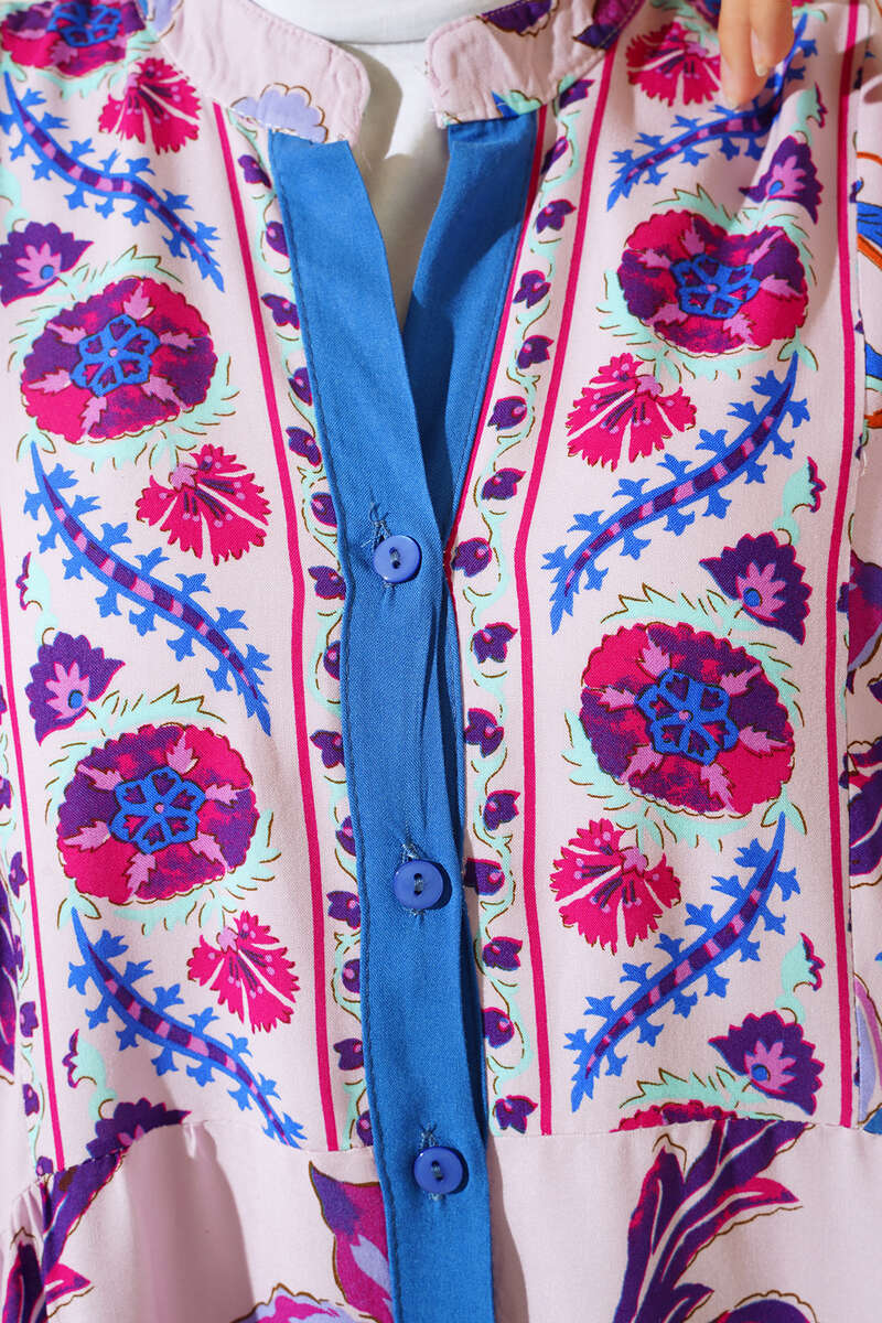 Sezonun gözde desenleri elbiseleri süslemeye devem ediyor. Oldukça tarz olan elbisemiz düğmeleriyle detaylanmıştır. Yarasa kol olan elbisemizin bilekleri lastiklidir. Salaş yapı olan elbisemiz modaya ayak uyduran herkesin dolabında olması gerek.