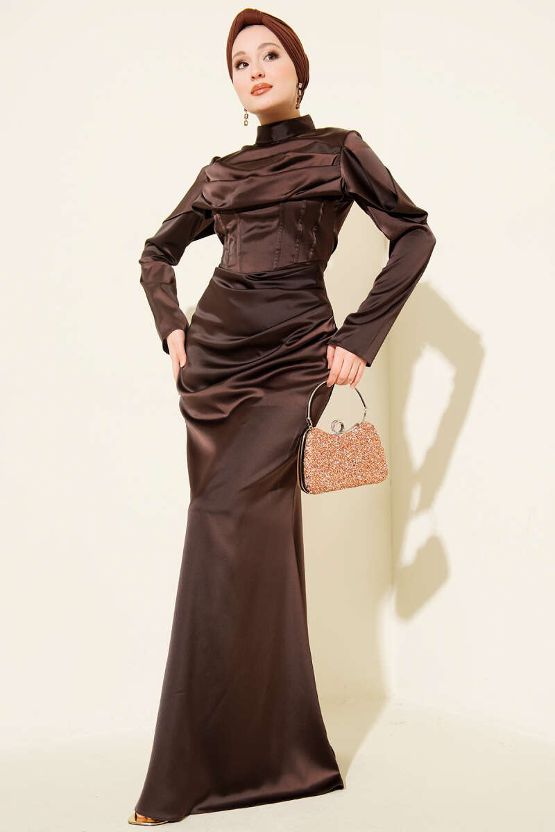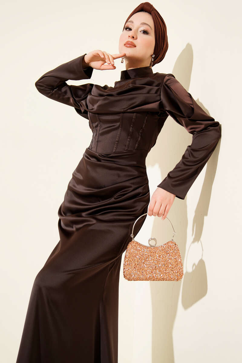 Yarım Yaka Fermuarlı Scuba Elbise Kahve