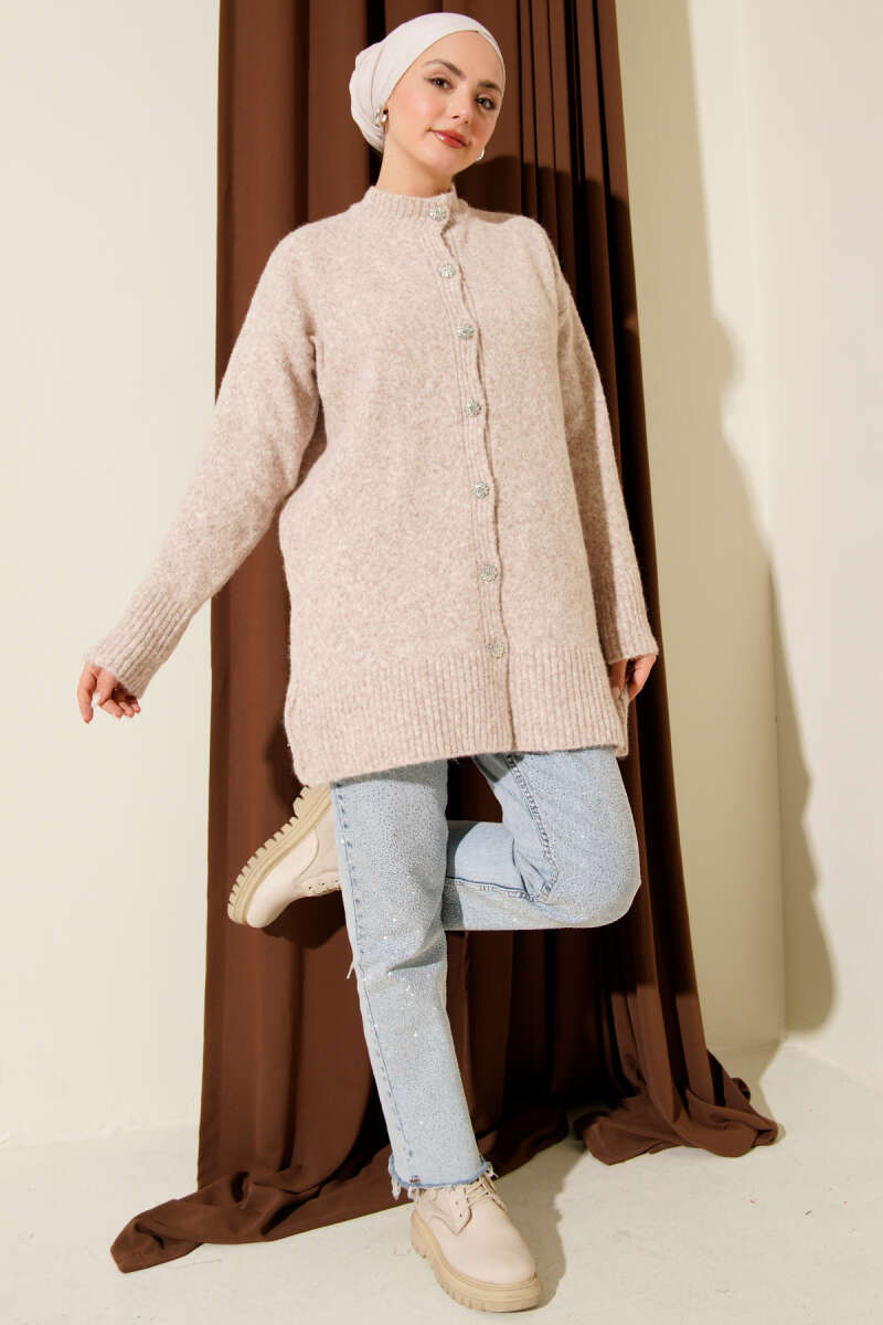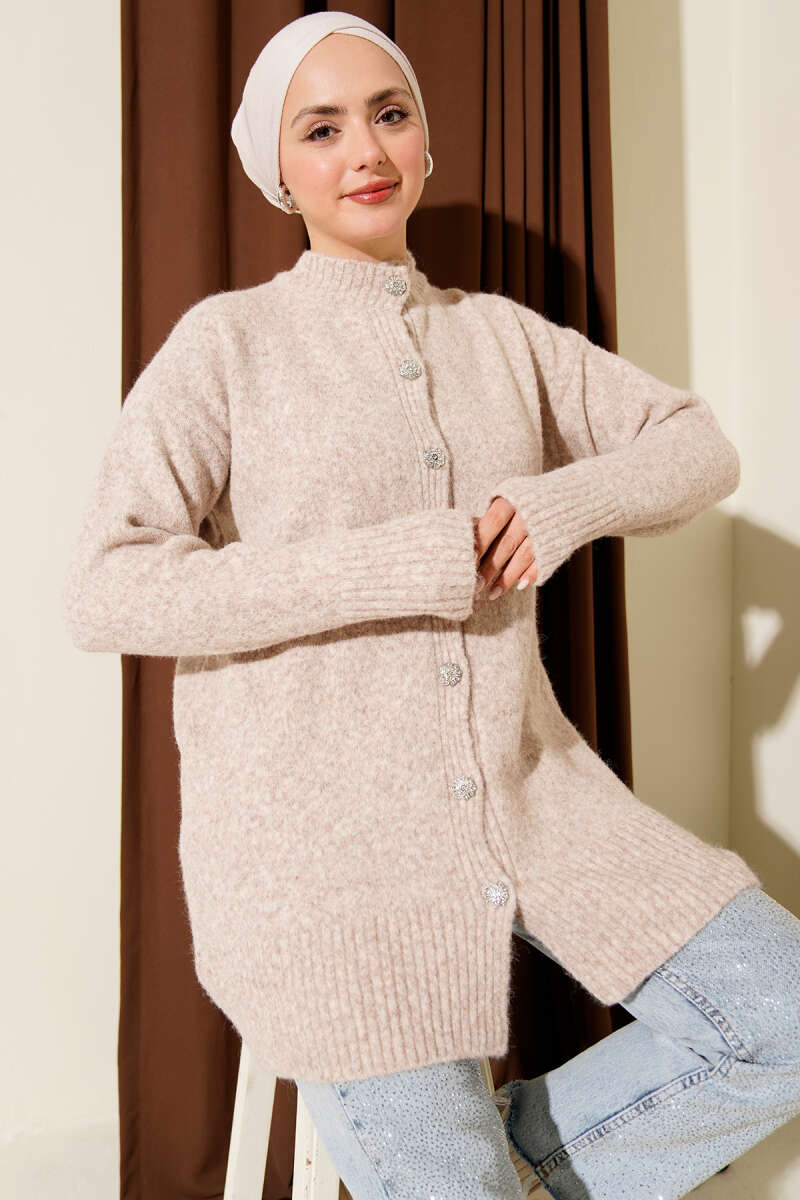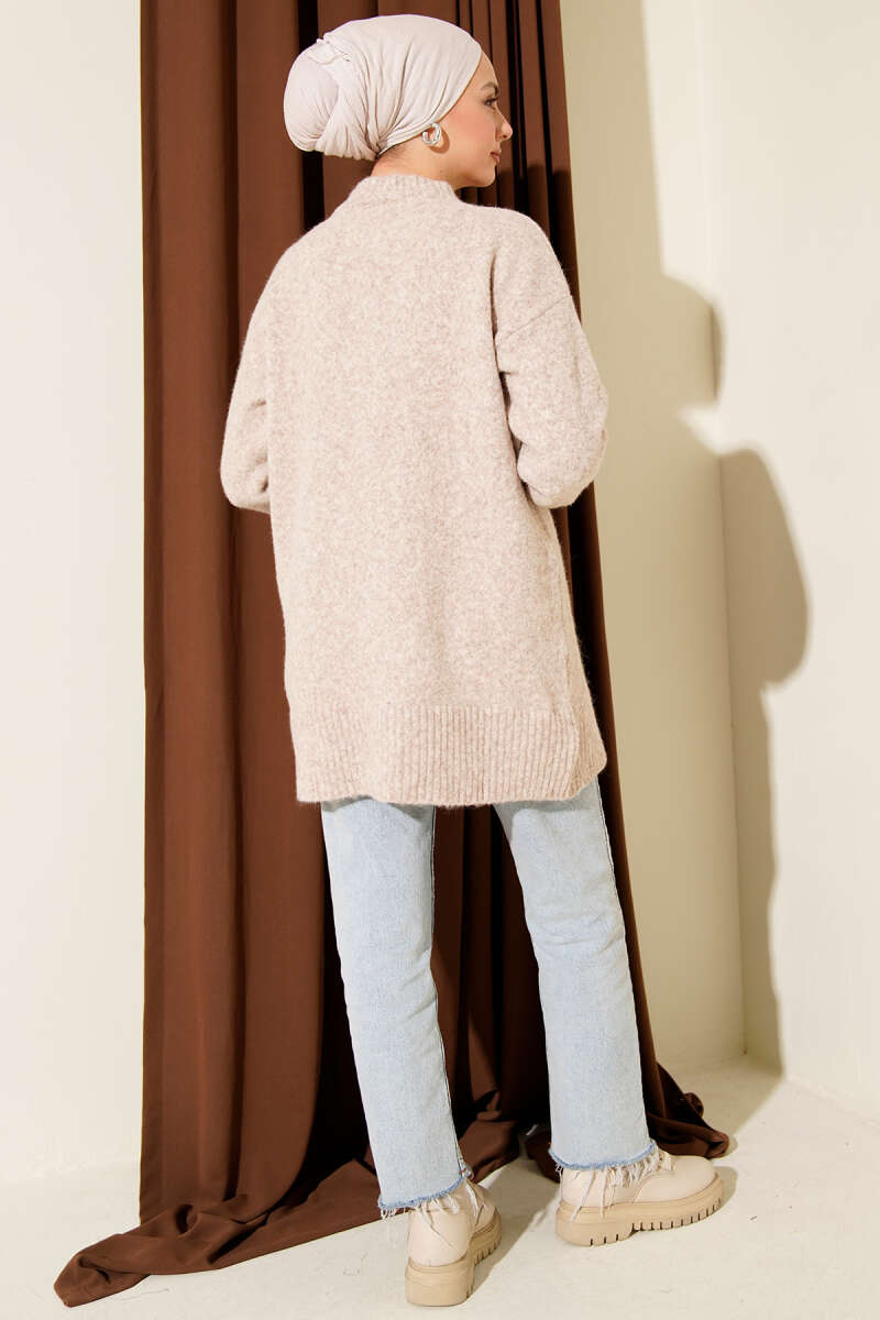 Çift Cepli Sakallı Triko Hırka Vizon