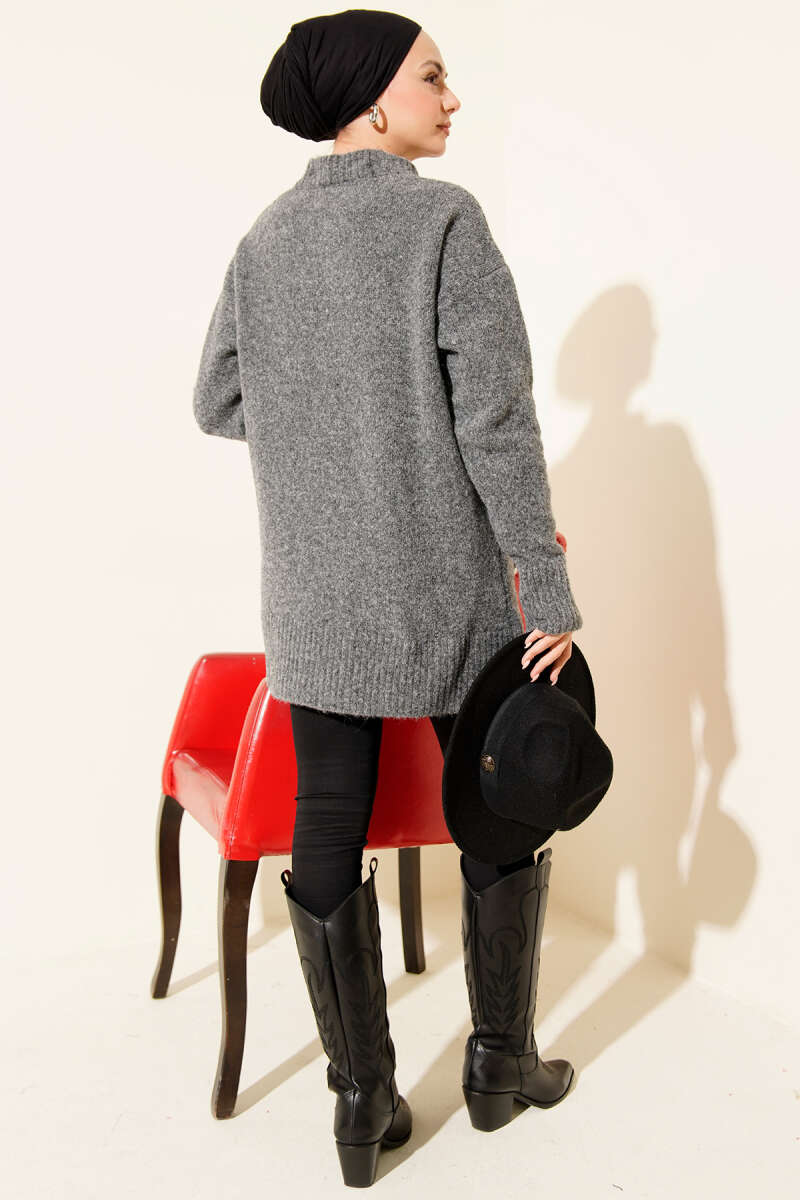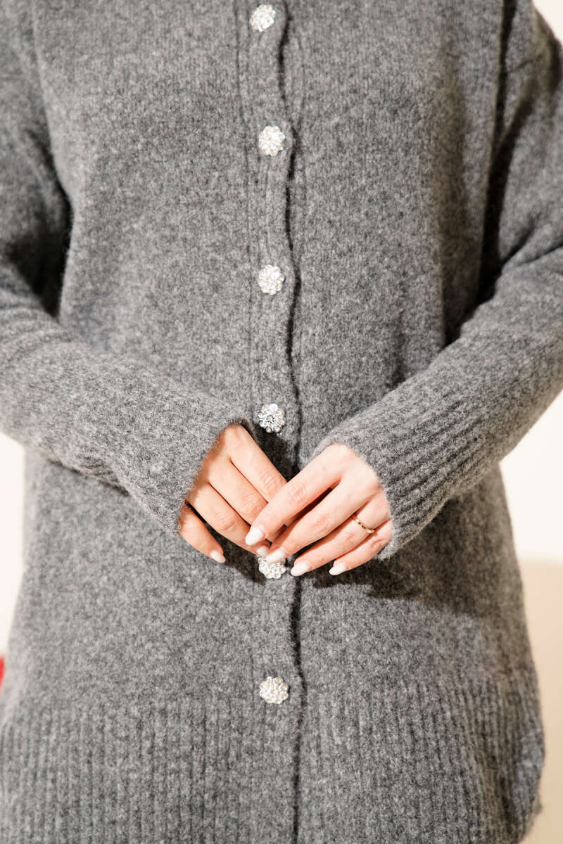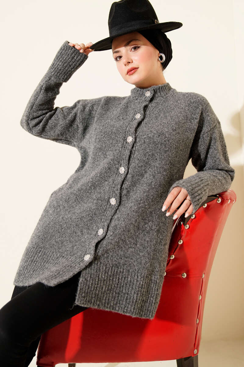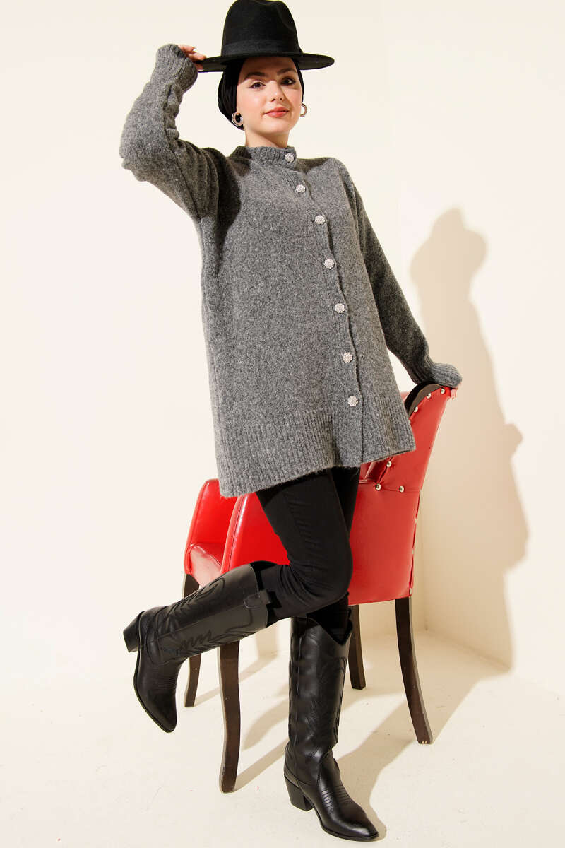 Düşük Omuz Düğmeli Triko Hırka Gri