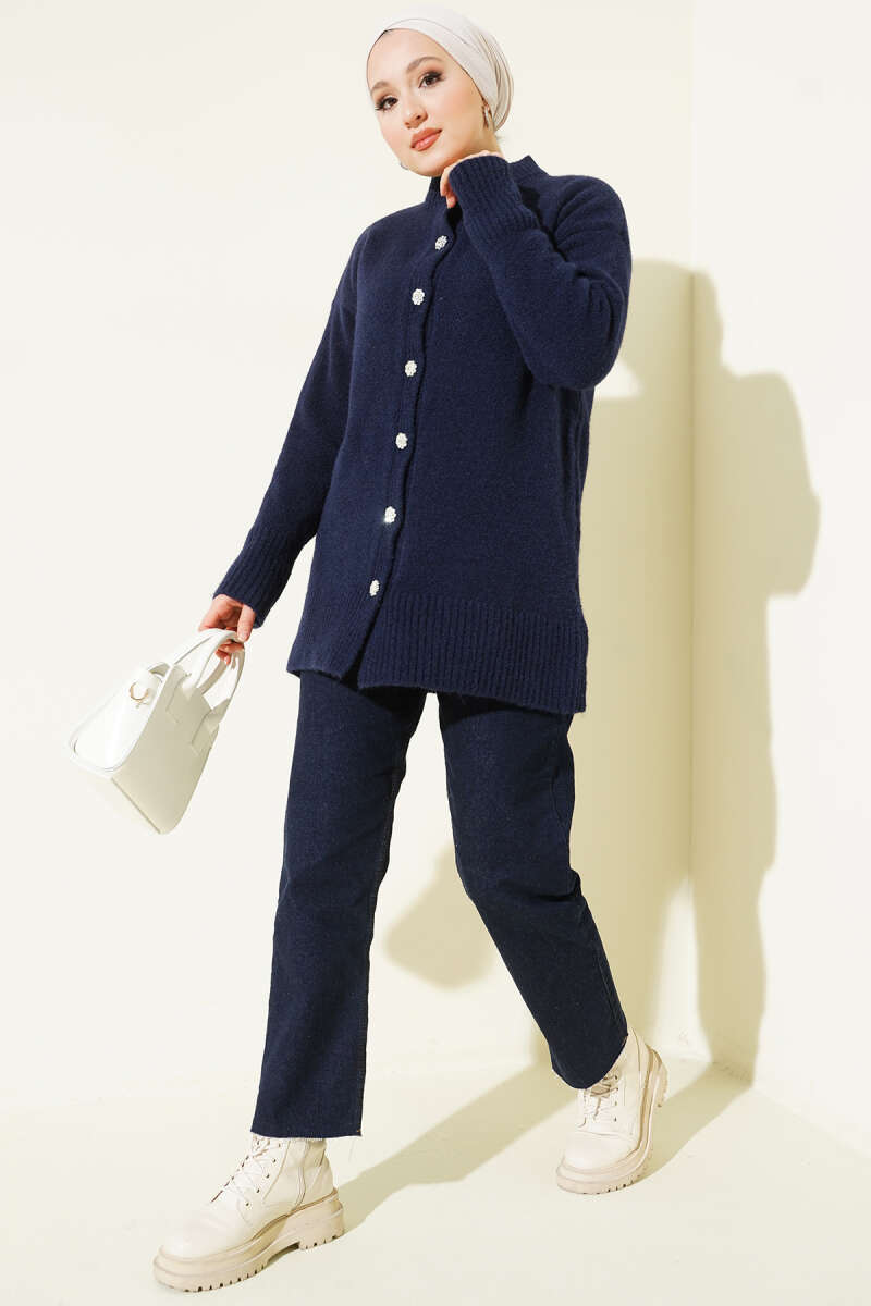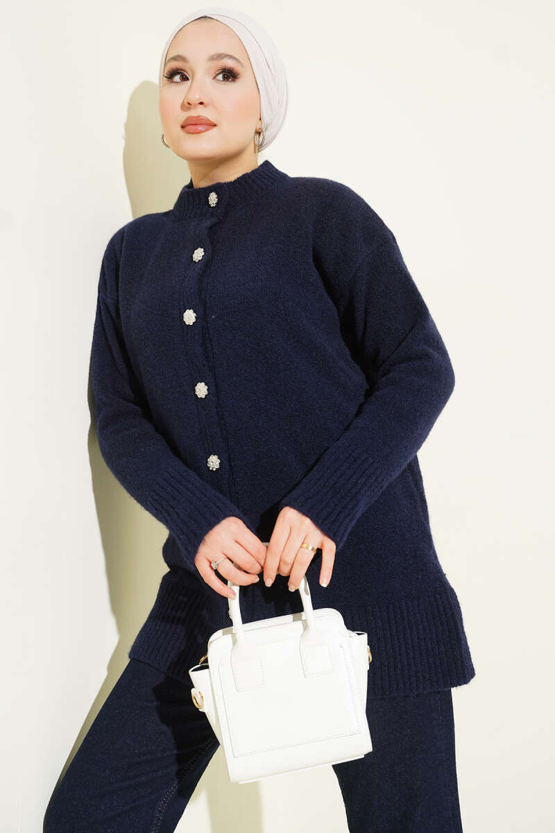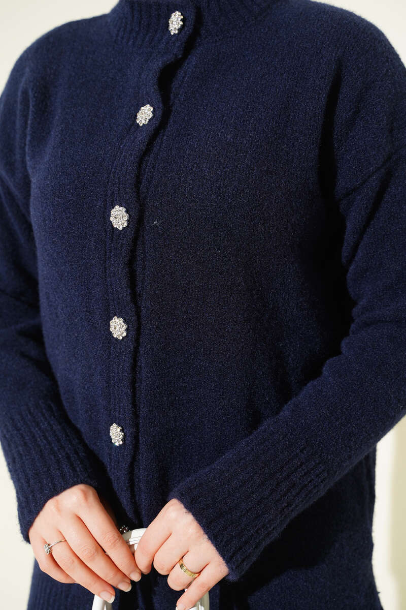 Fularlı Düğmeli Triko Hırka Mürdüm