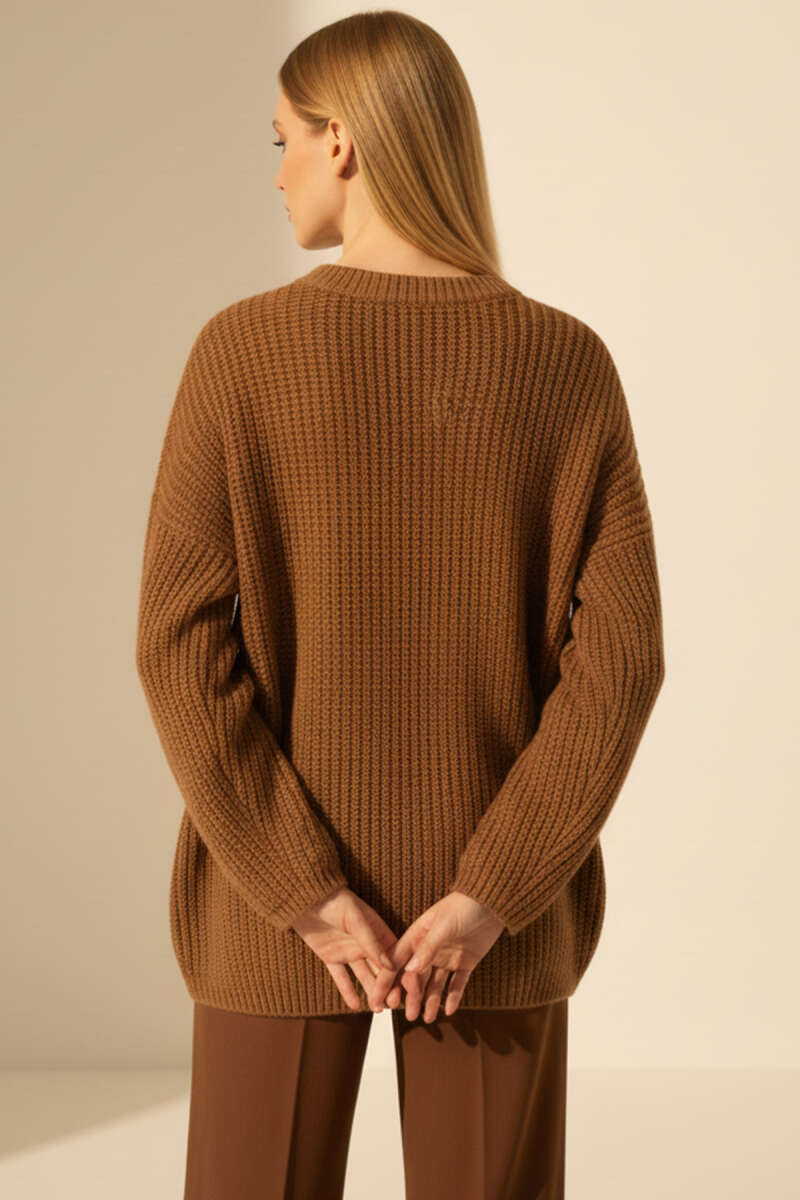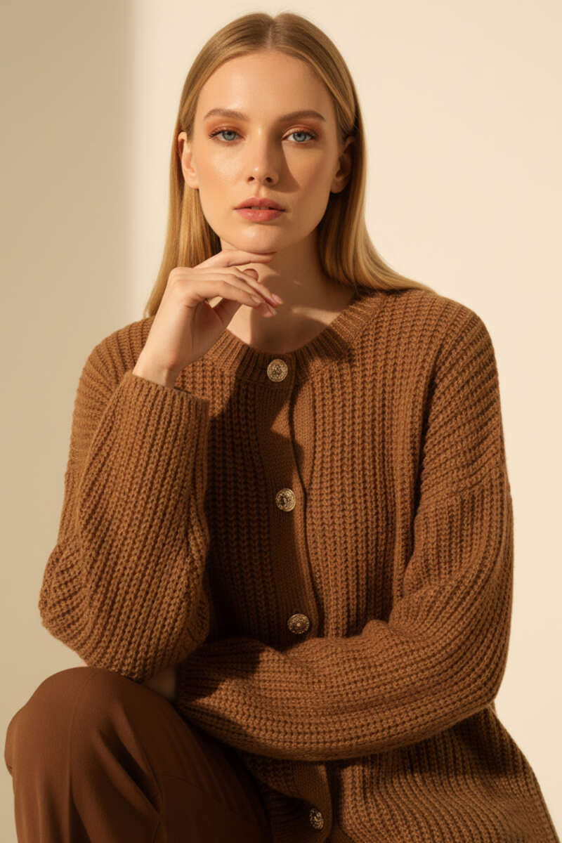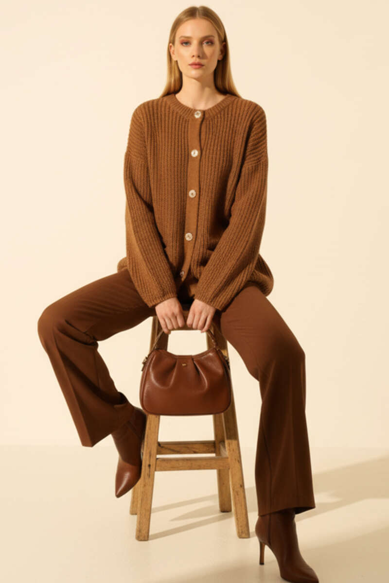 Düğme Detaylı Cepli Triko Hırka Kahve