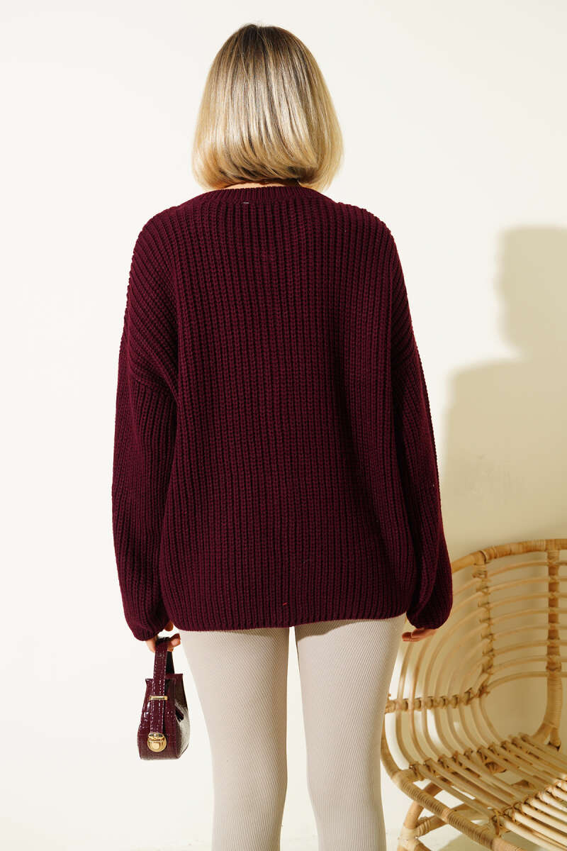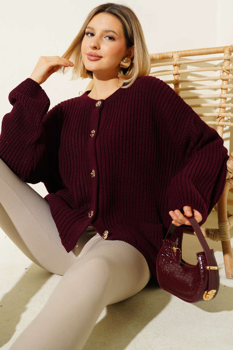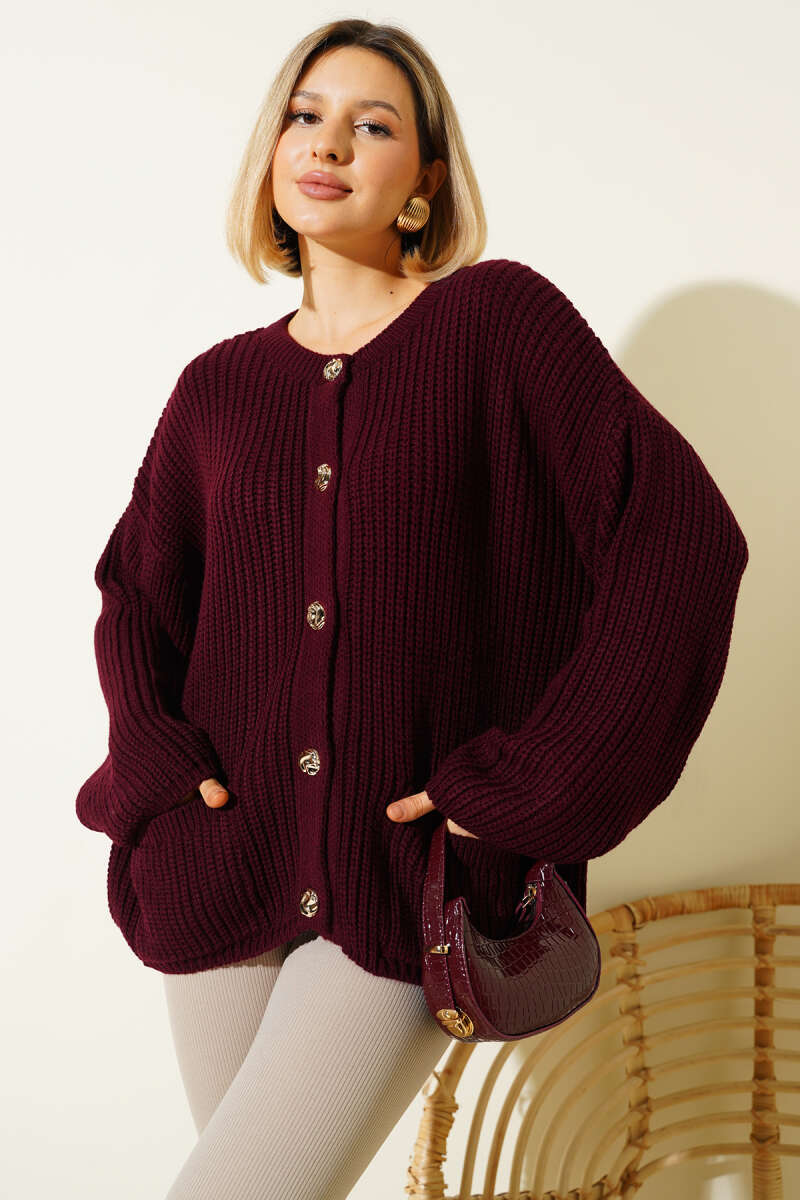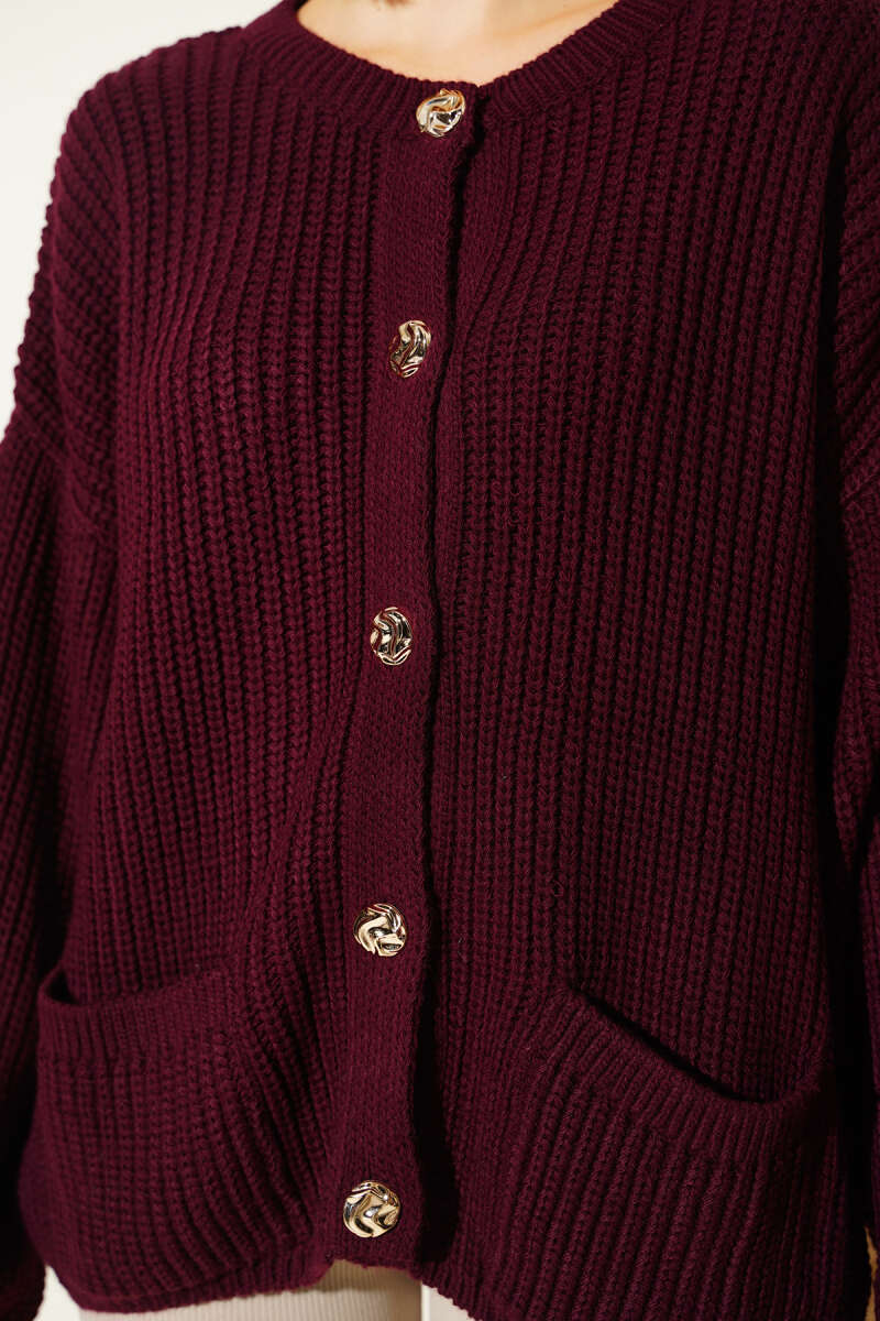 Düğme Detaylı Cepli Triko Hırka Mürdüm