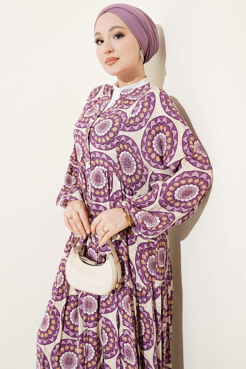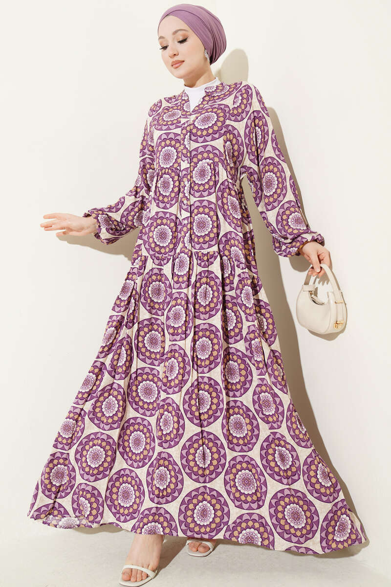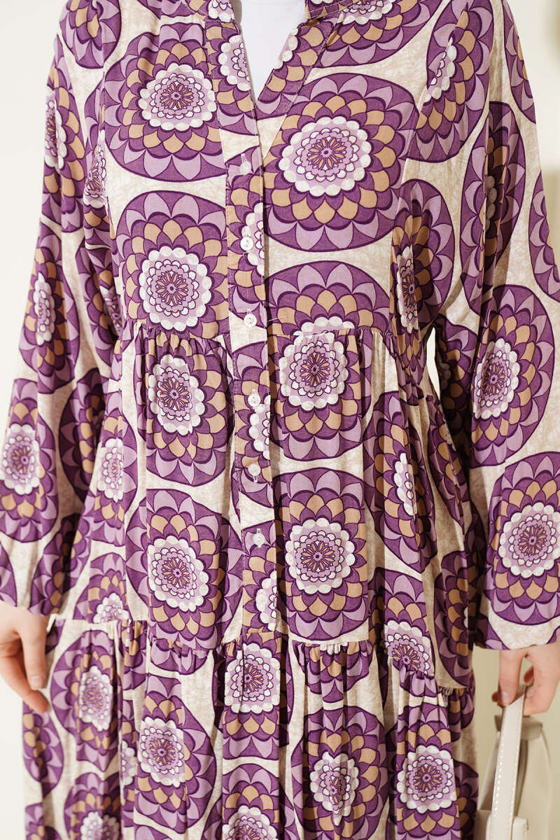 Düğme Detaylı Desenli Elbise Lila