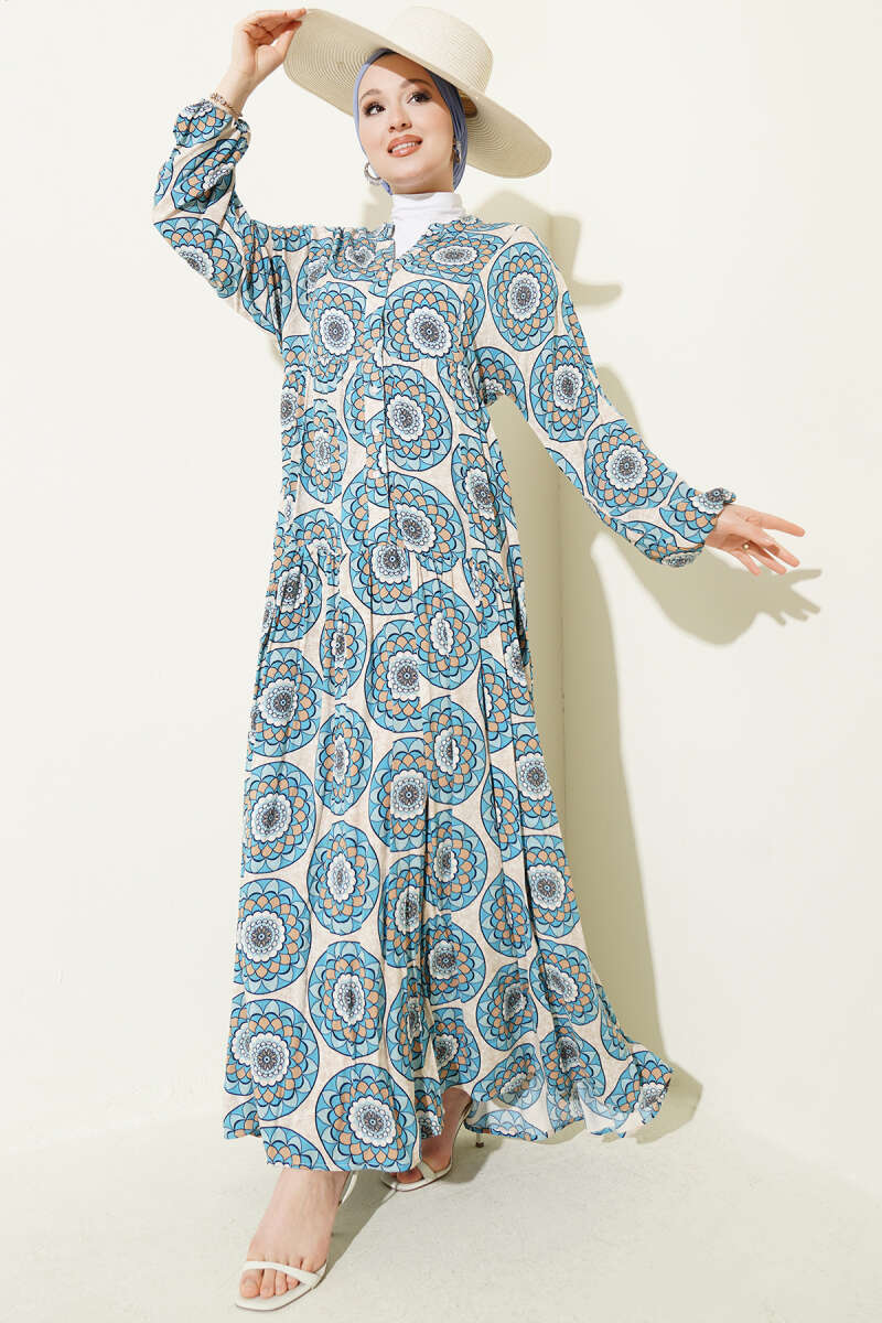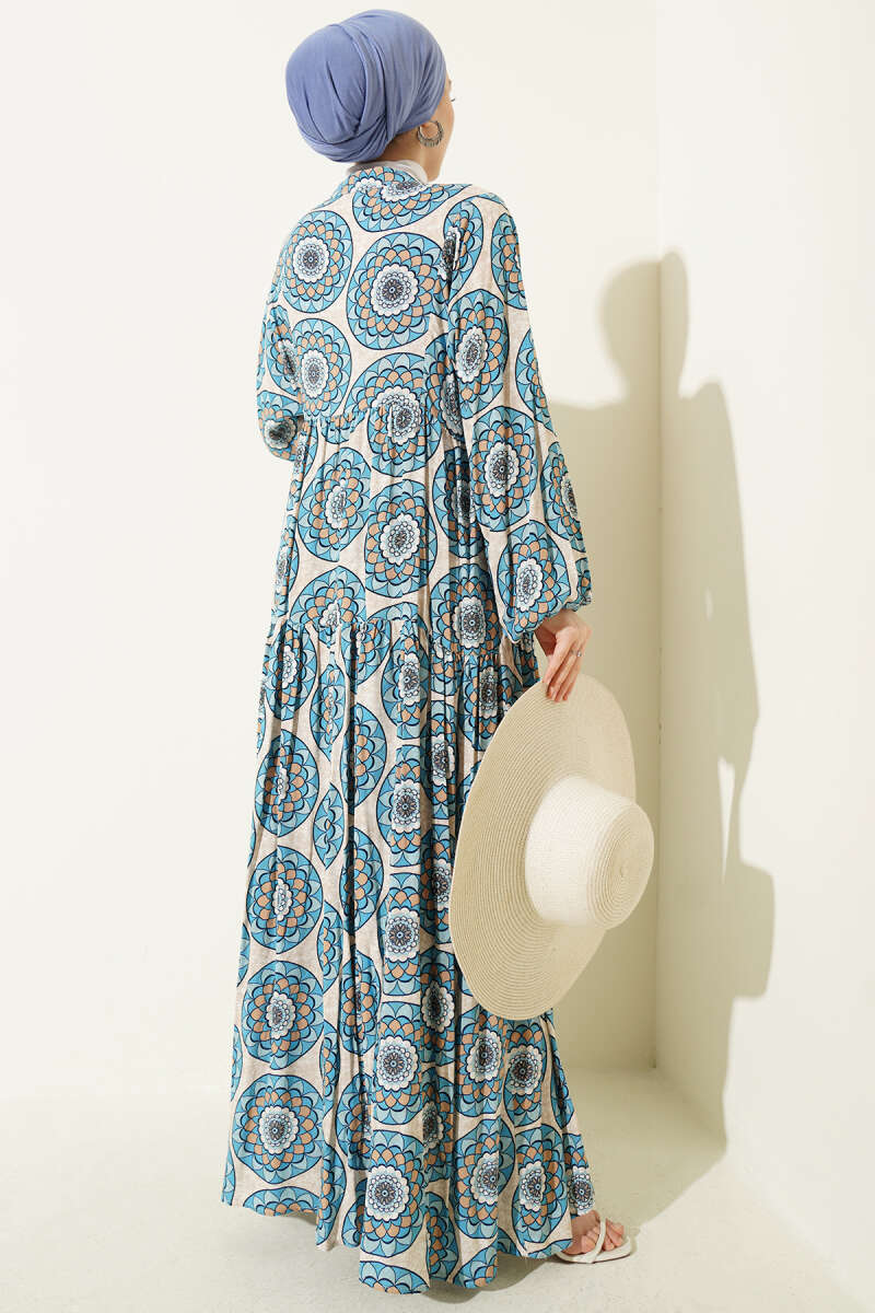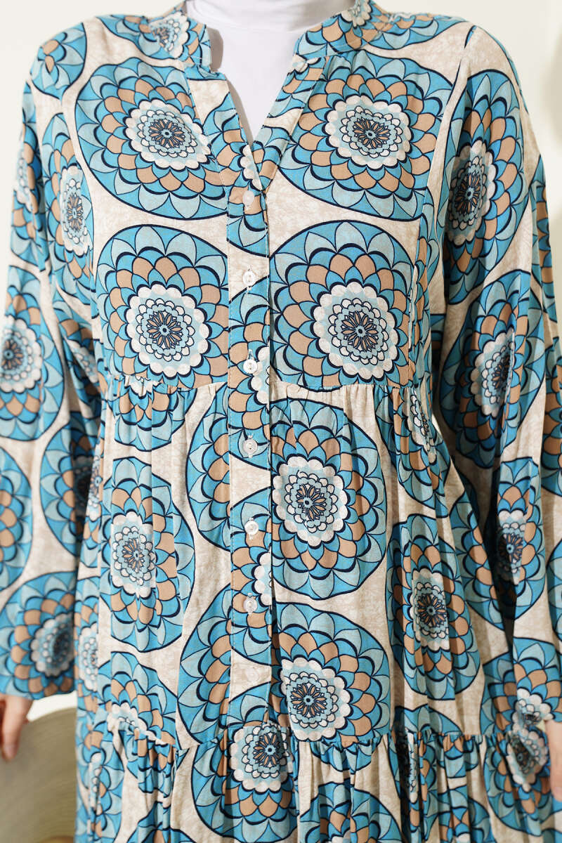 Düğme Detaylı Desenli Elbise Mavi
