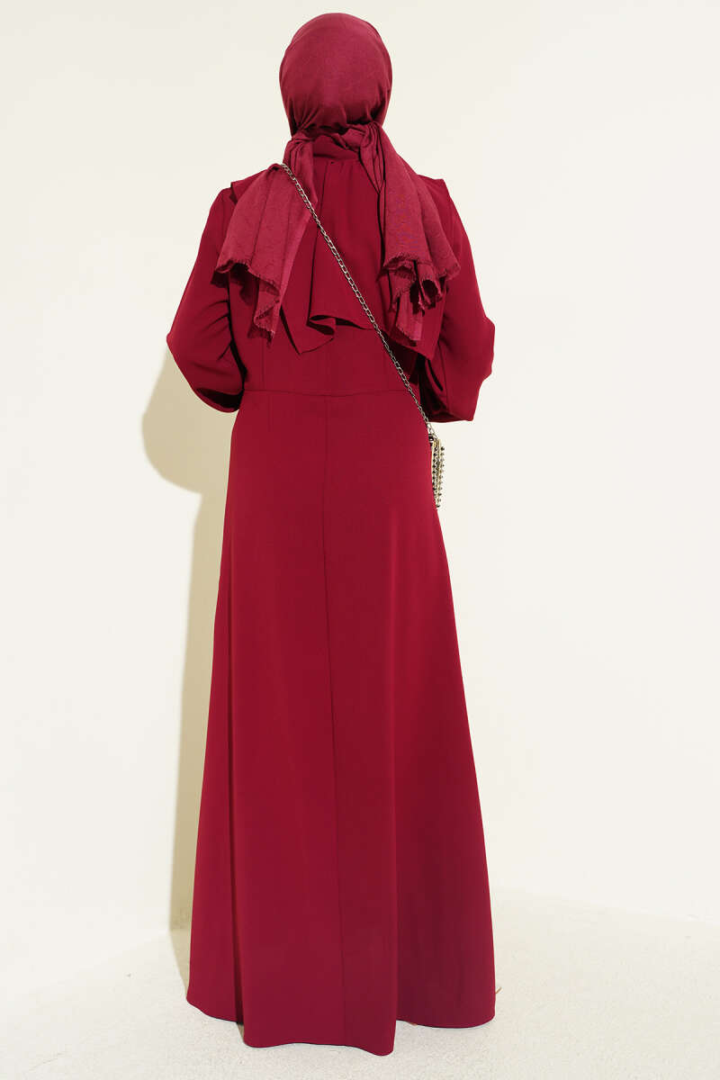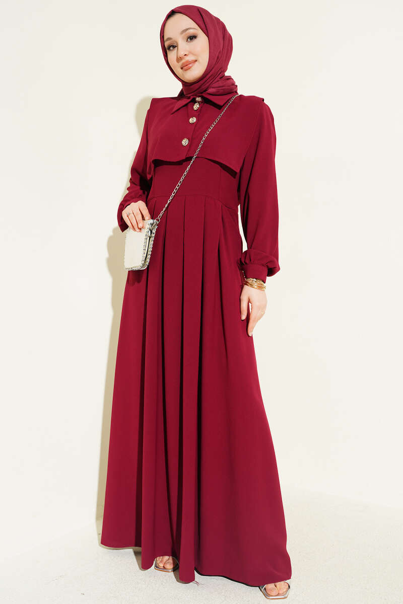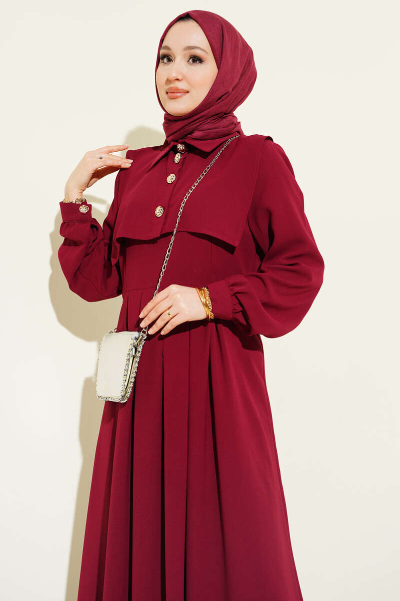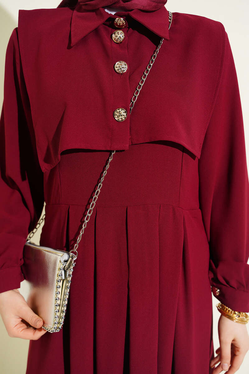 Boydan Düğmeli Pensli Elbise Bordo