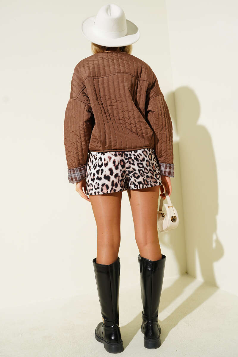 Kruvaze Yaka Düğmeli Kürklü Mont Kahve
