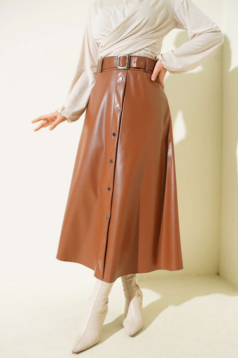 Düğme Detaylı Kemerli Deri Etek Siyah