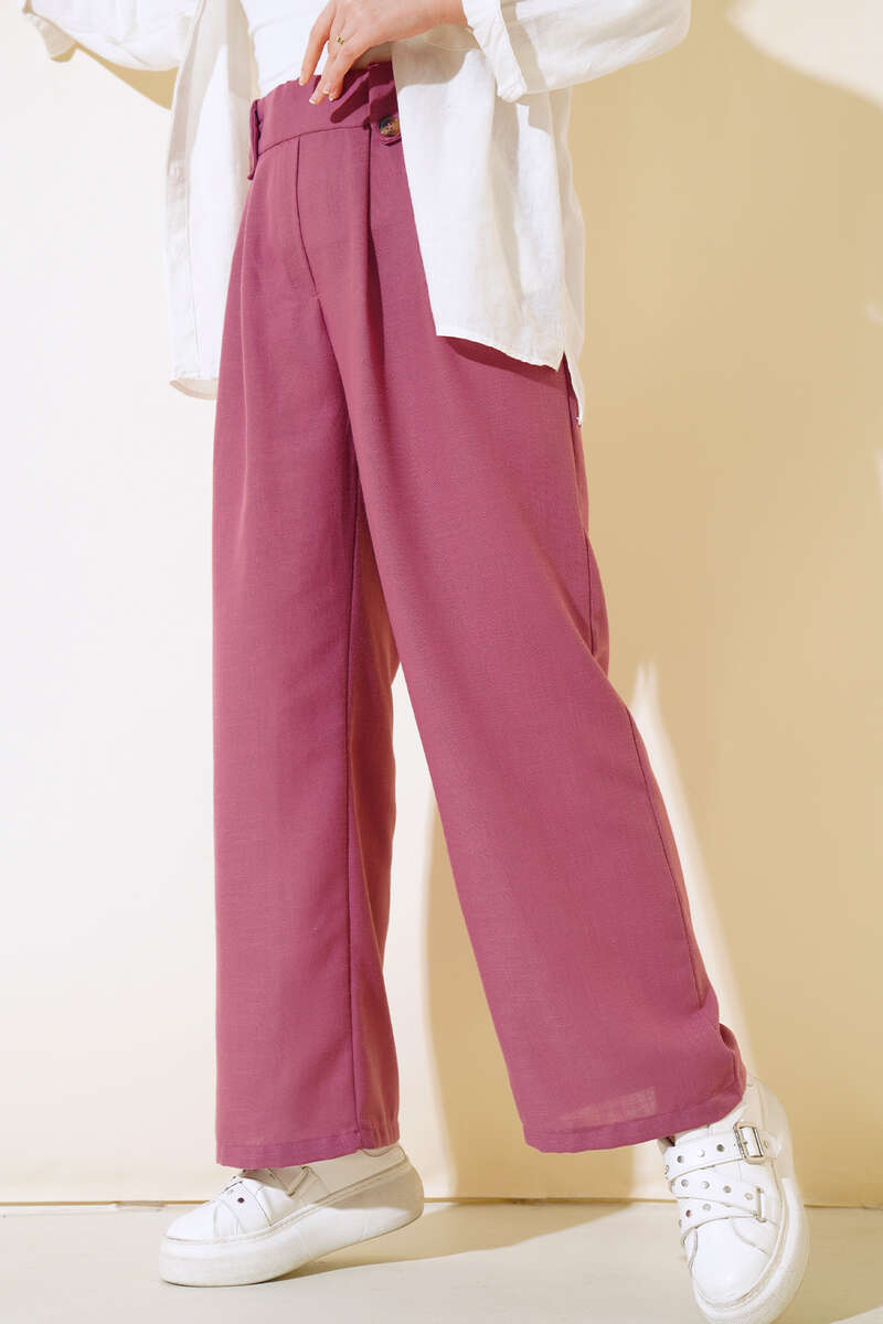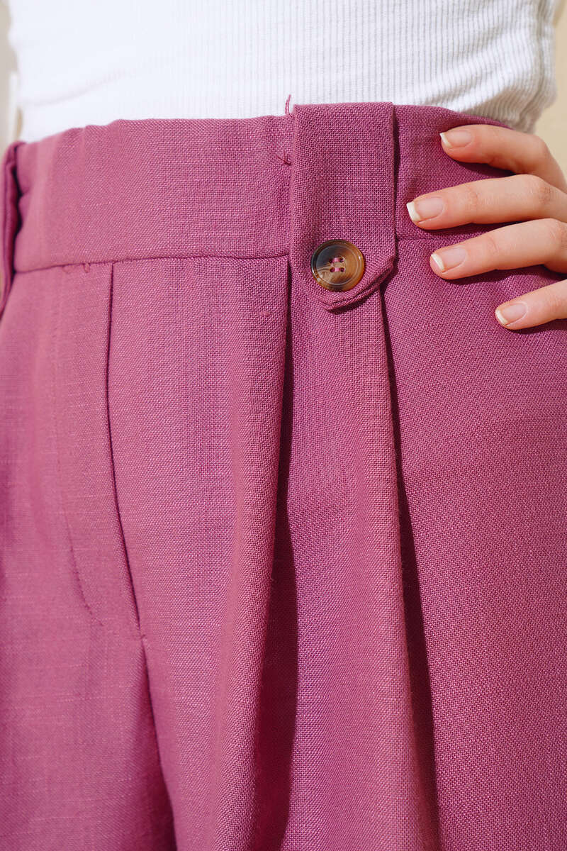 Düğme Detaylı Keten Salaş Pantolon Magenta