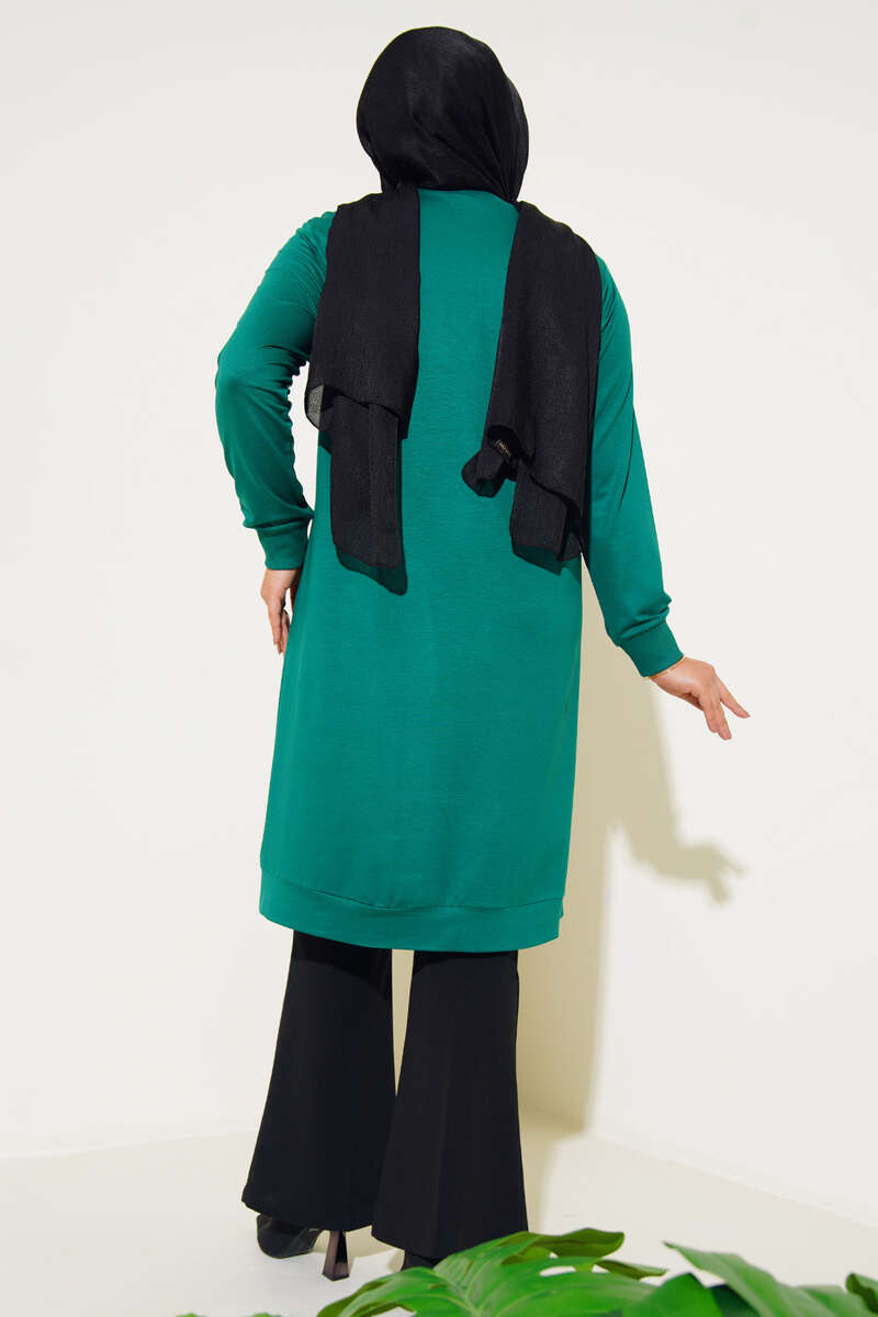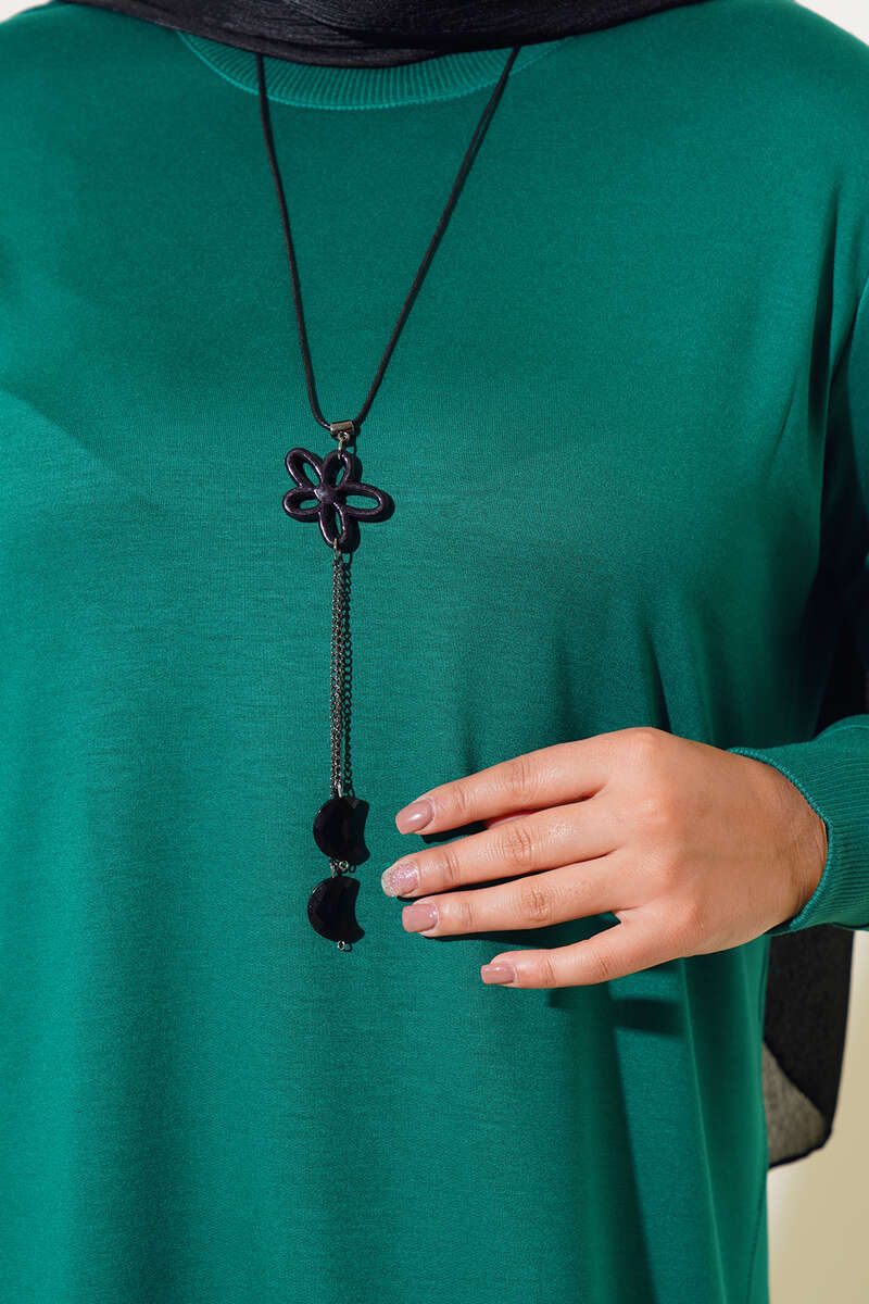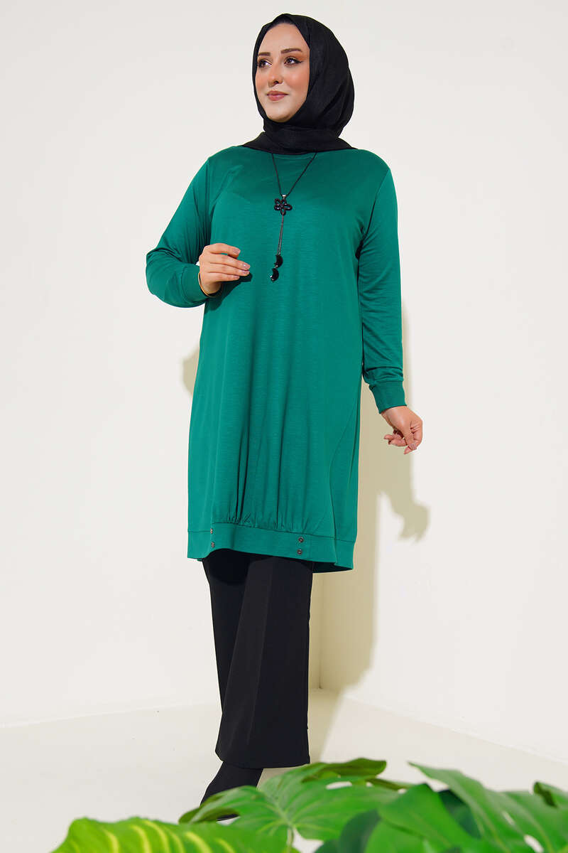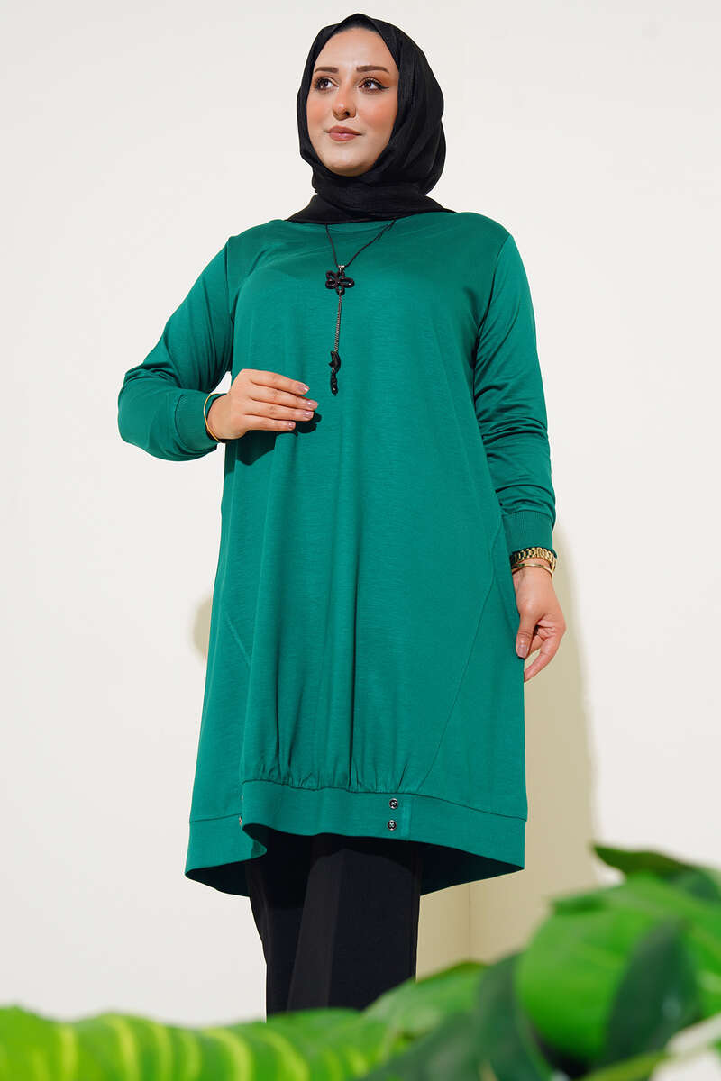 Büyük beden tuniğimiz sezonun yenileri arasında yerini aldı... Tuniğimiz düşük omuzlu modeldir. Etek ucuna pilise detayları bulunan tuniğimiz düğme süslemeleri ile tamamlanmıştır.. Bisiklet yakaya sahiptir. Çiçek tokalı kolyesi ürüne aittir.