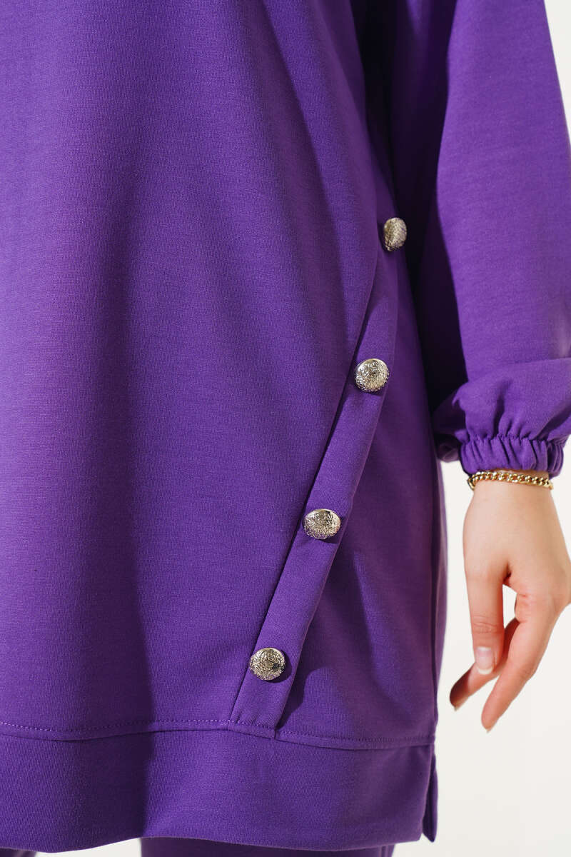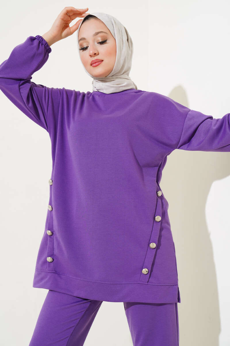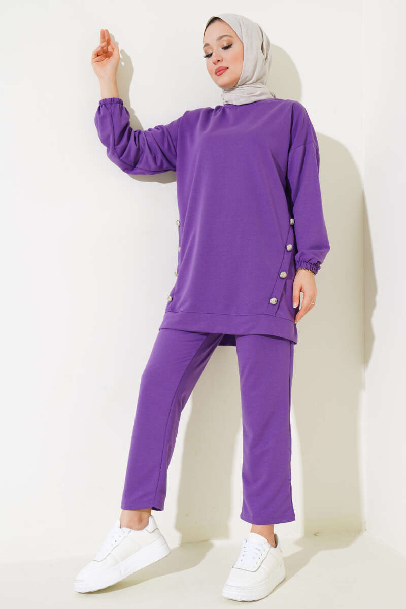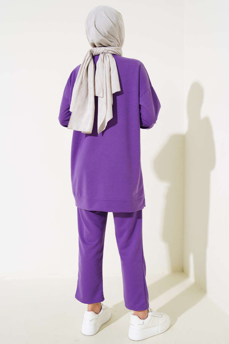 Çizgi Garnili Bisiklet Yaka Loyşa İkili Takım Mürdüm