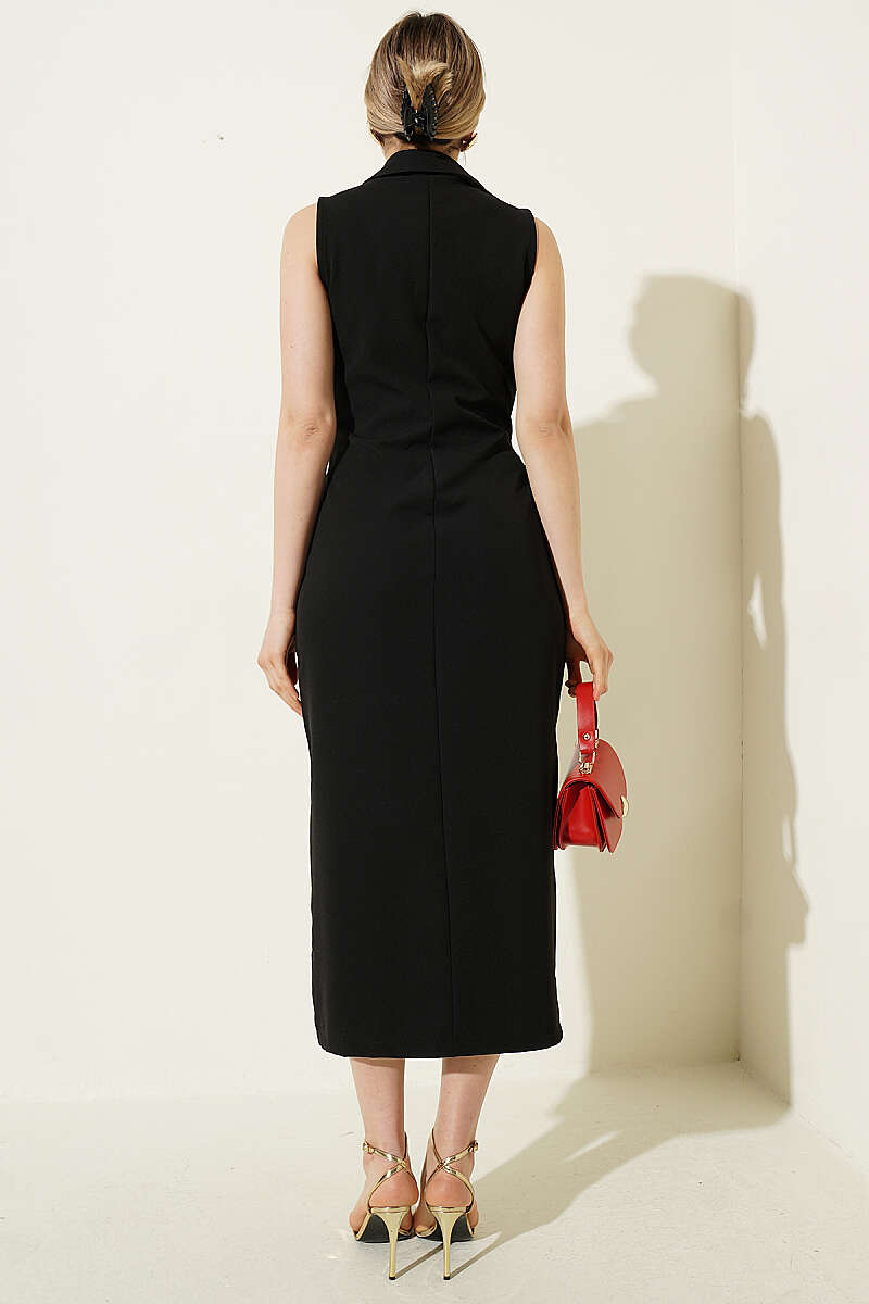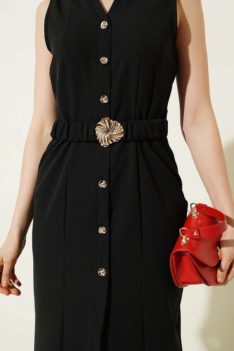 Düğme Görünümlü Kolsuz Midi Elbise Siyah