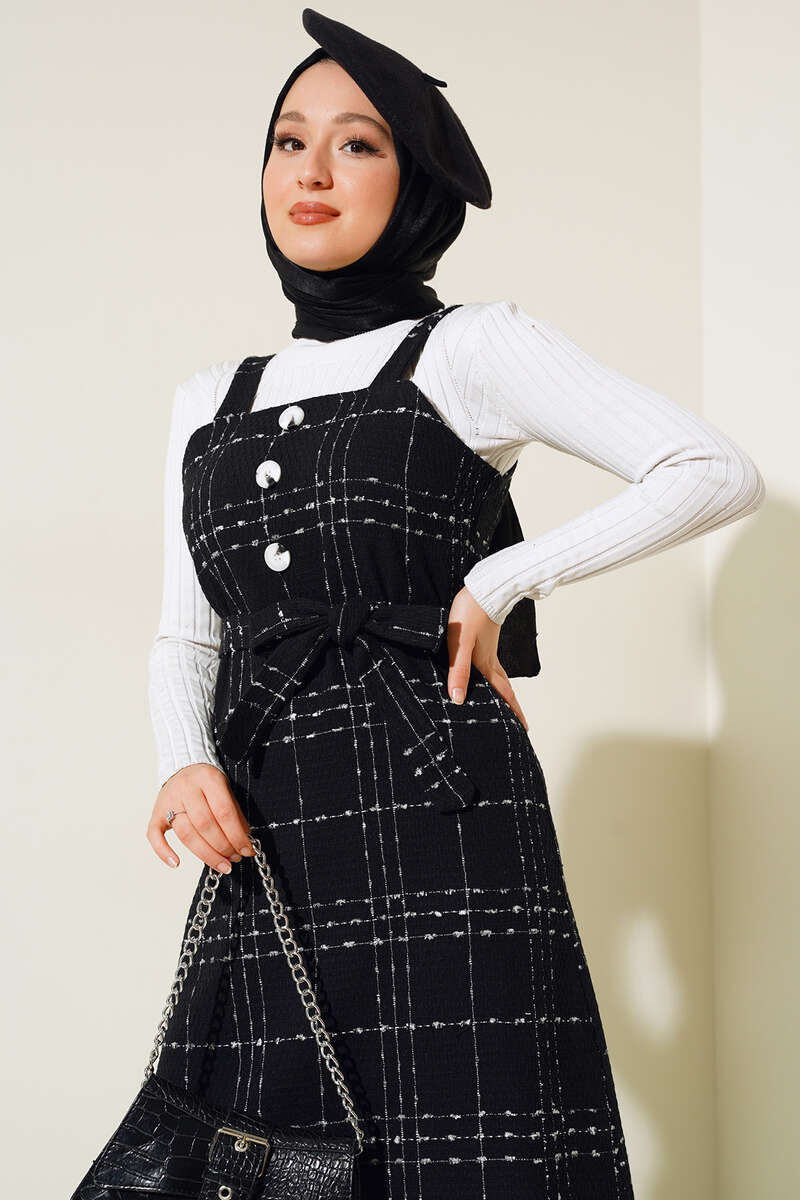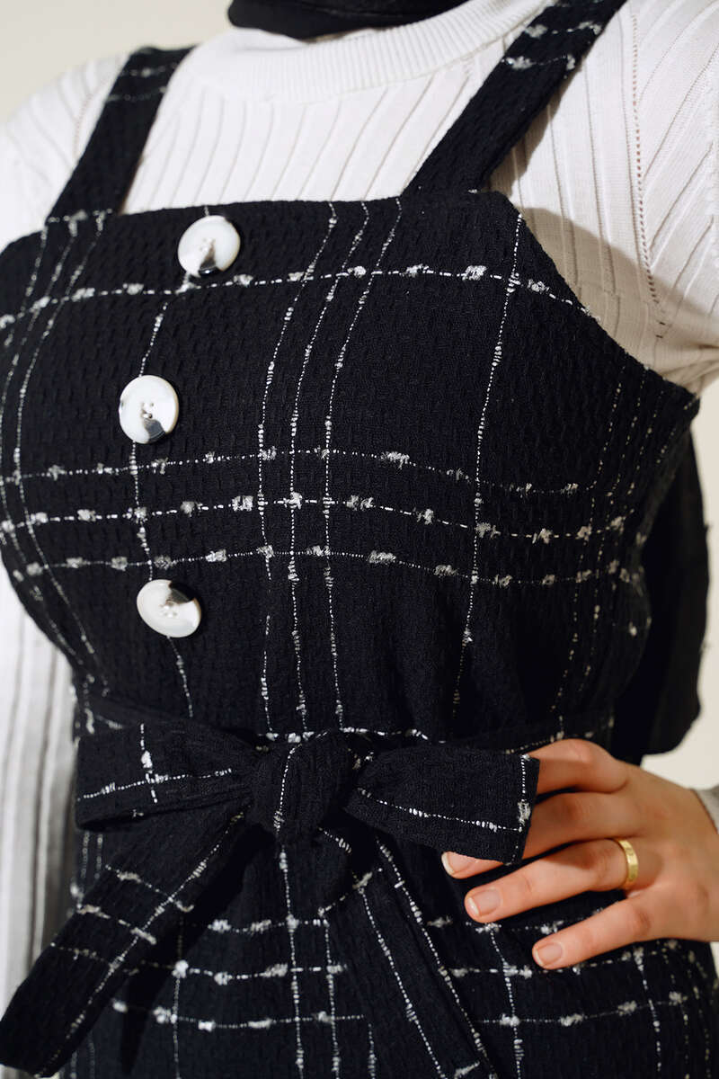 Yeni sezon jile elbisemiz size çok yakışacaktır. Şık duruşu güzel bir kombin için doğru tercih olaccaktır. Askılı jile elbisemizin önü düğme süslemelidir. Kolay kullanımı için yandan fermuarlıdır. Beli kuşaklı olan elbisemiz sezonun favorilerinden biri.