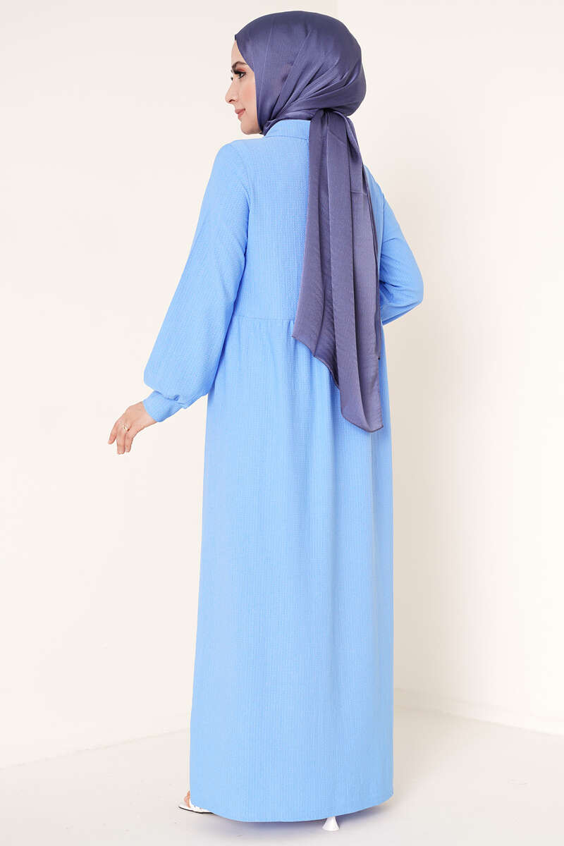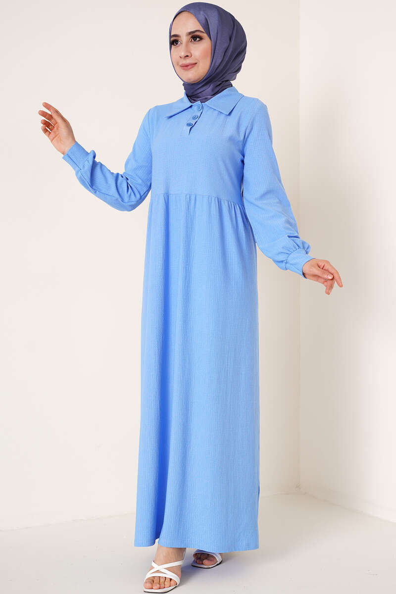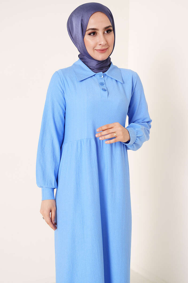 Yeni sezon bürümcük elbisemiz klasik yakadır. Yakasına eşlik eden üç adet düğmesi elbiseyi şık bir görünüm kazandırmıştır. Sade ve rahat bir kombini tek parçada elde edeceğiniz elbisemiz renkleriyle sizi bekliyor. Kemer aksesuar olarak kullanılmıştır.
