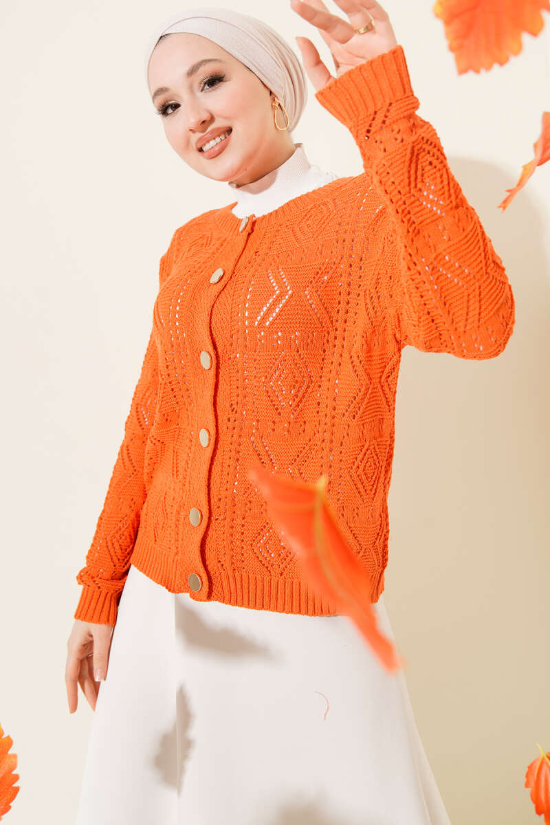 Düğmeli Ajurlu Kısa Triko Hırka Oranj