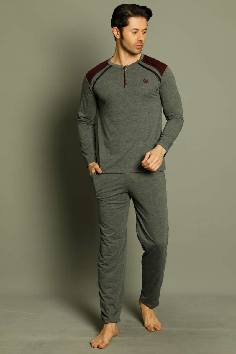 Düğmeli Armalı Erkek Pijama Takımı Füme Bordo