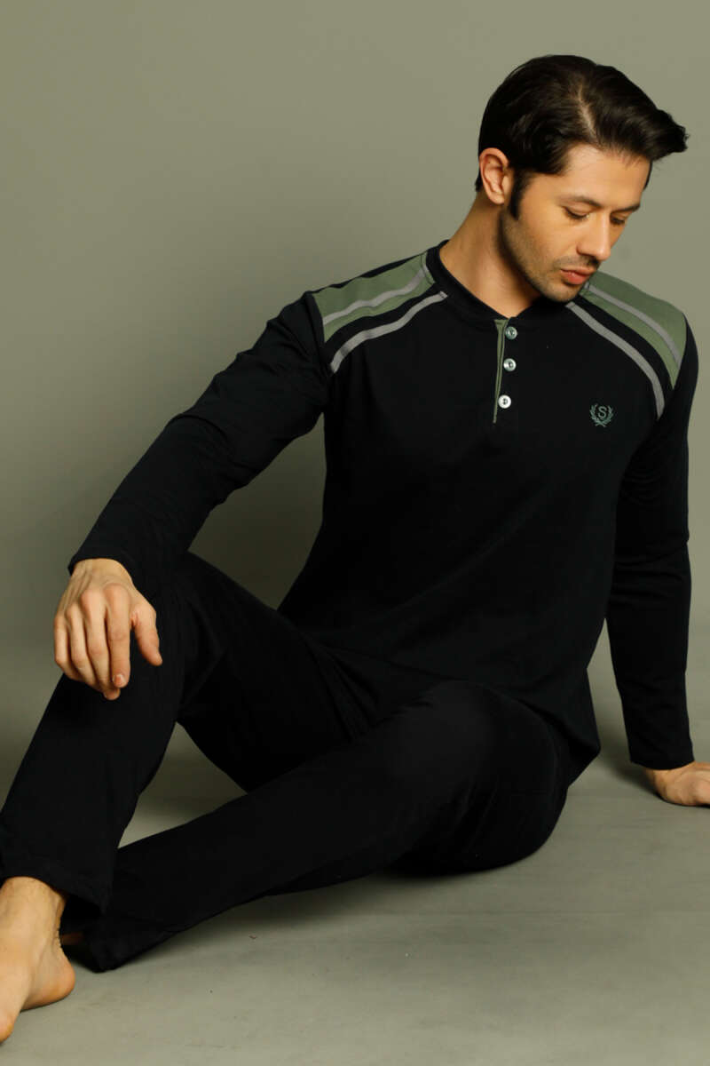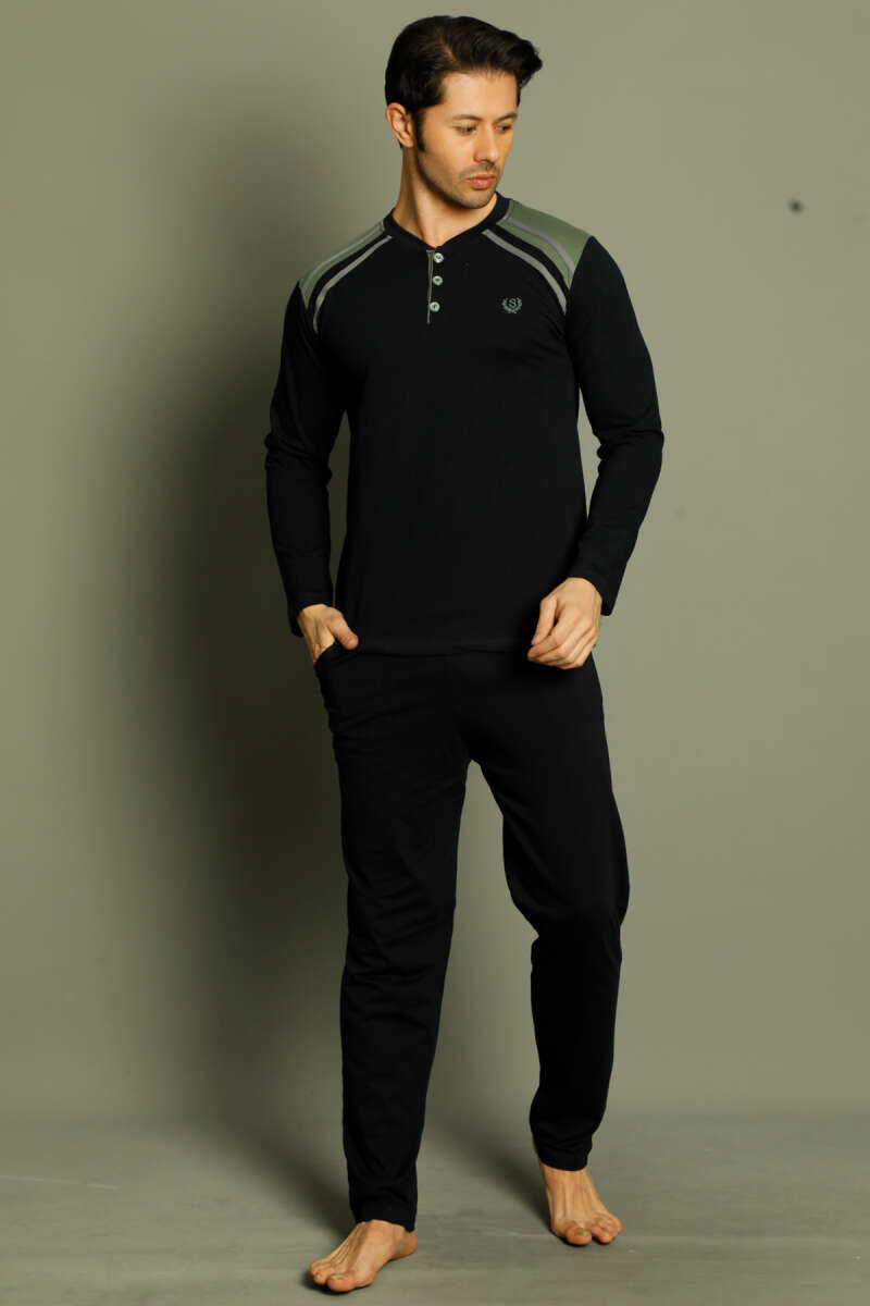 Düğmeli Armalı Erkek Pijama Takımı Lacivert Haki