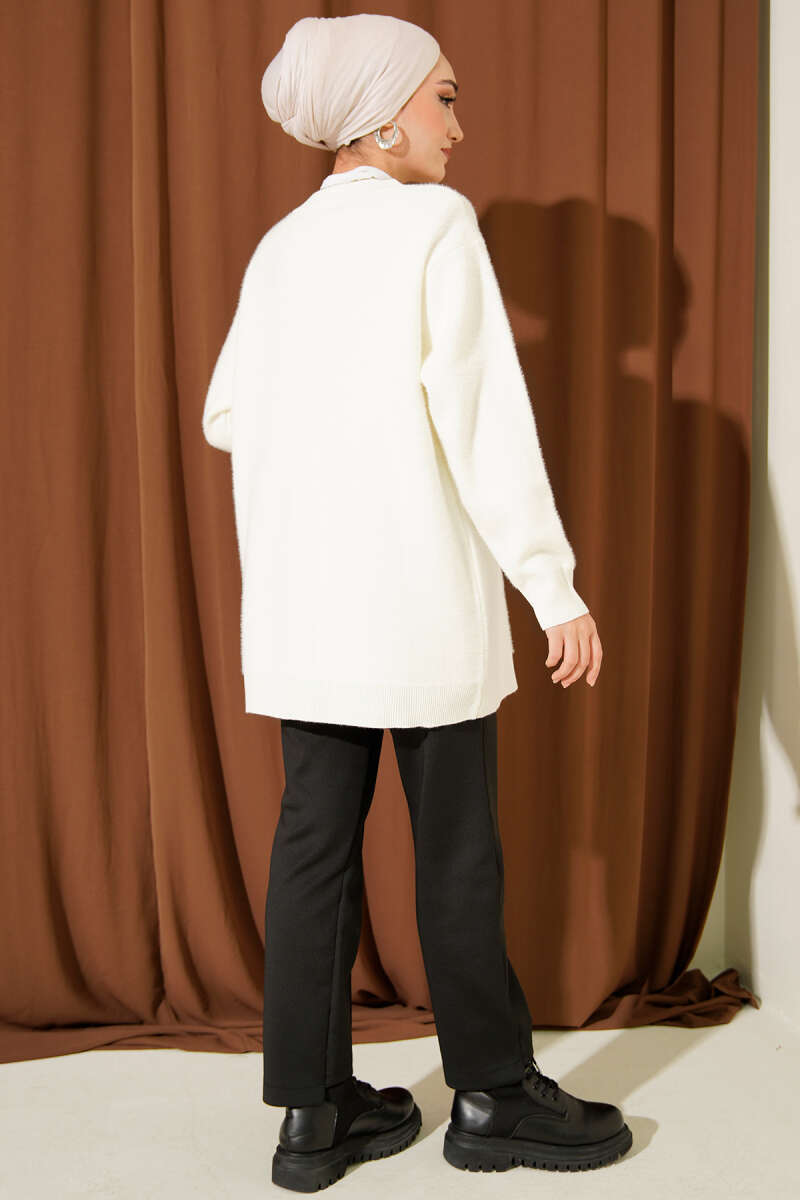 Bel Lastikli Düğmeli Sakallı Triko Hırka Ekru