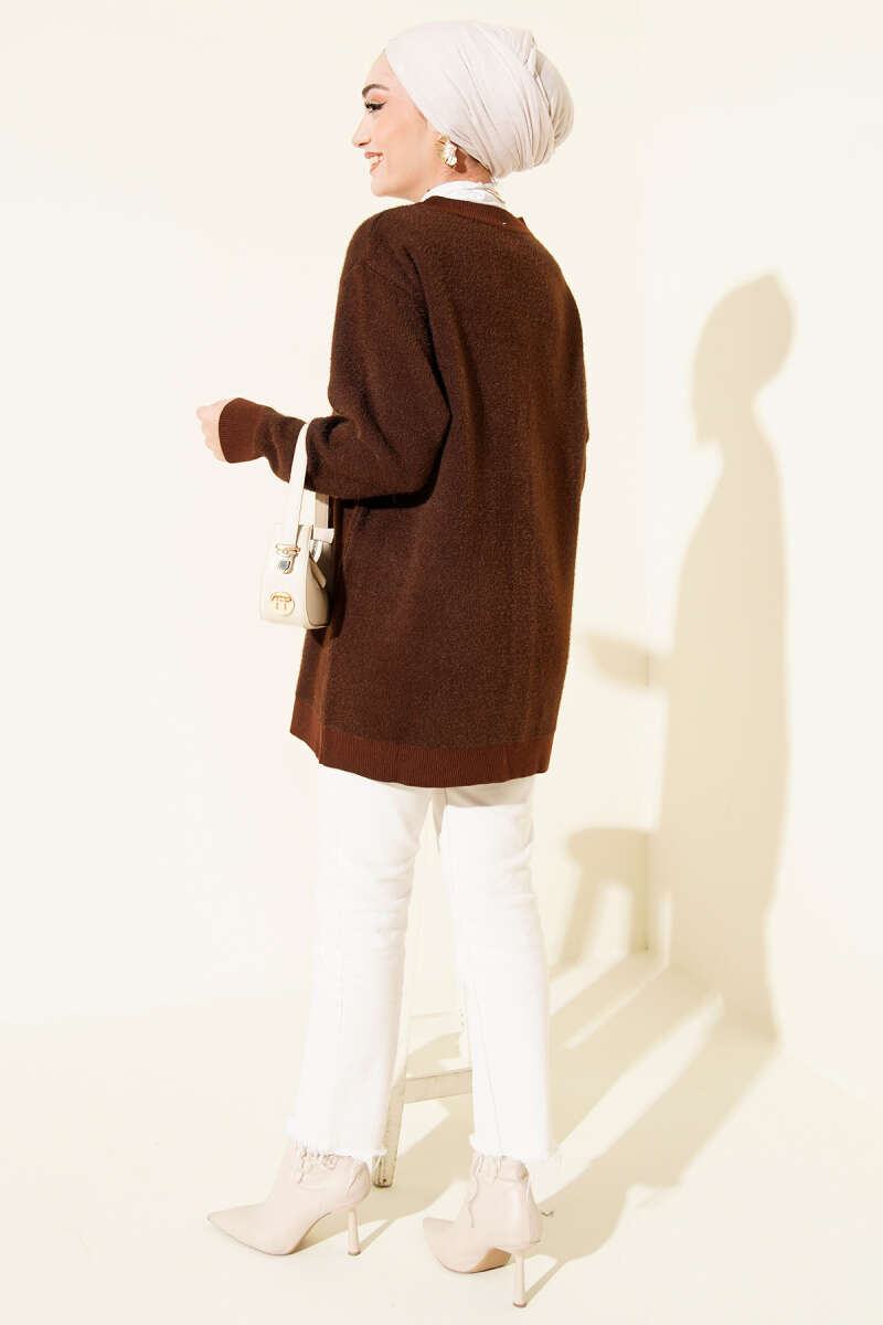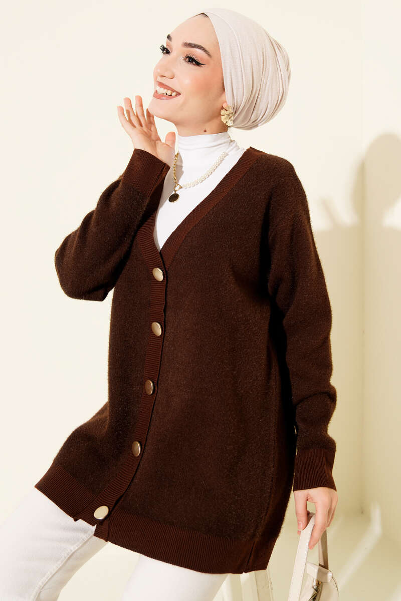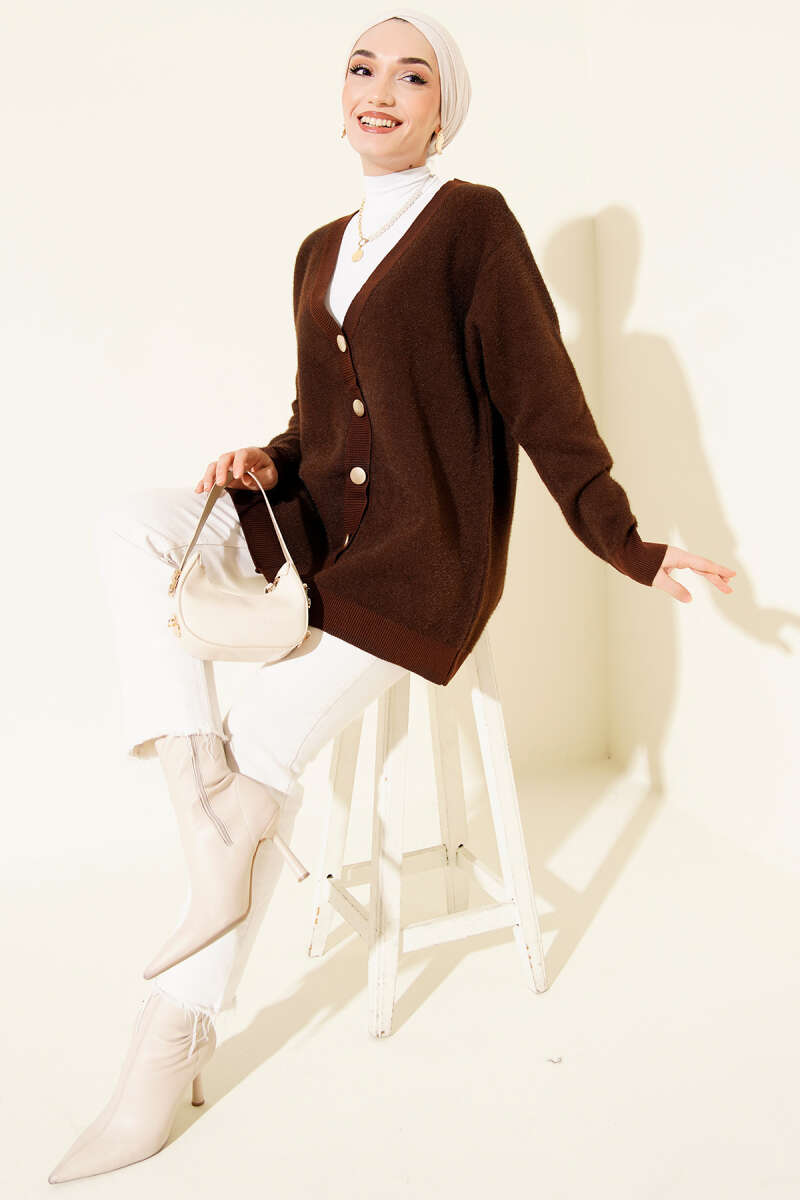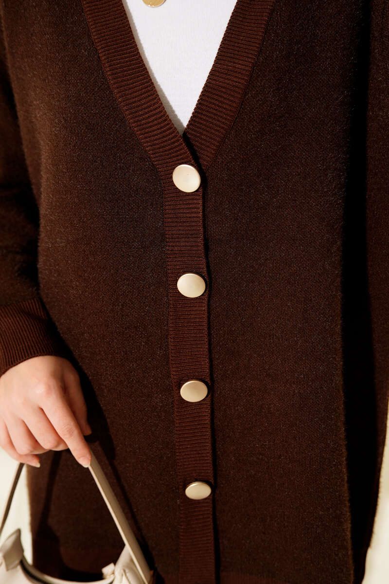 Gold Düğmeli Basic Sakallı Triko Hırka Kahve