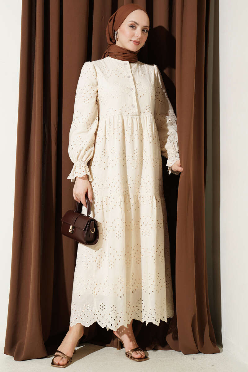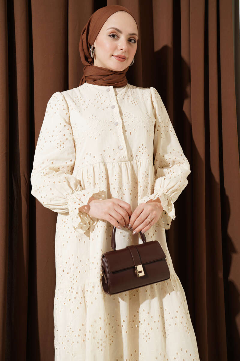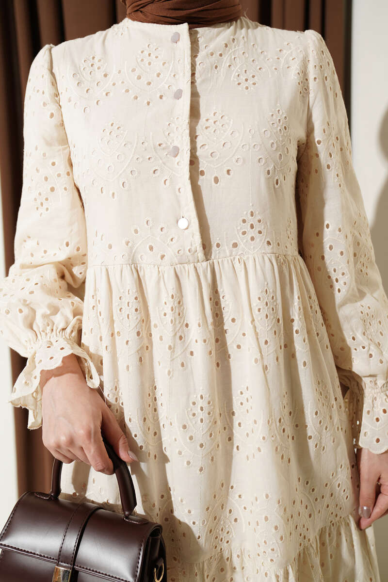 Düğmeli Brode Bilek Lastikli Elbise Bej