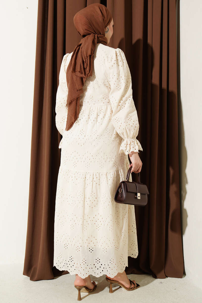 Düğmeli Brode Bilek Lastikli Elbise Beyaz