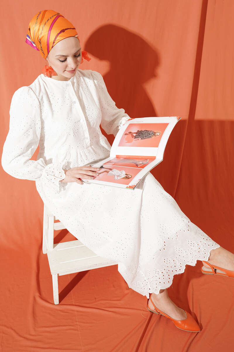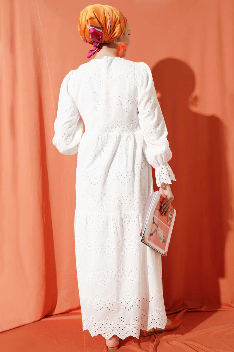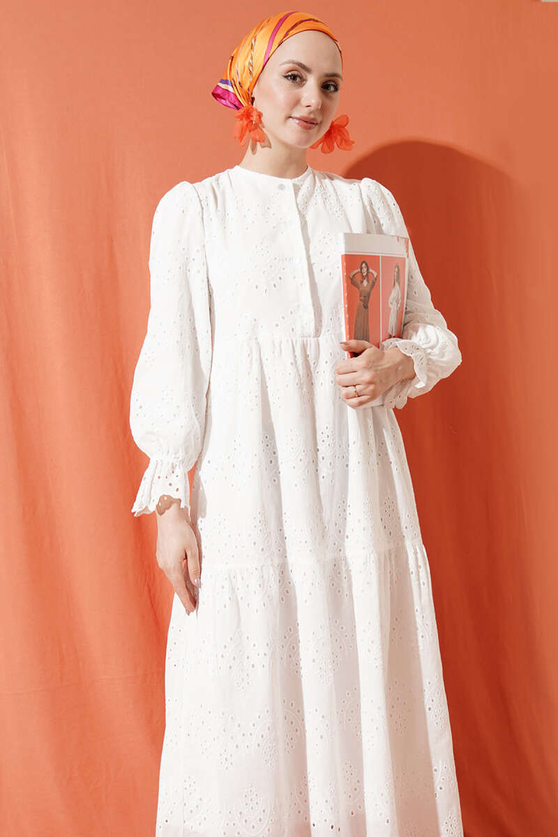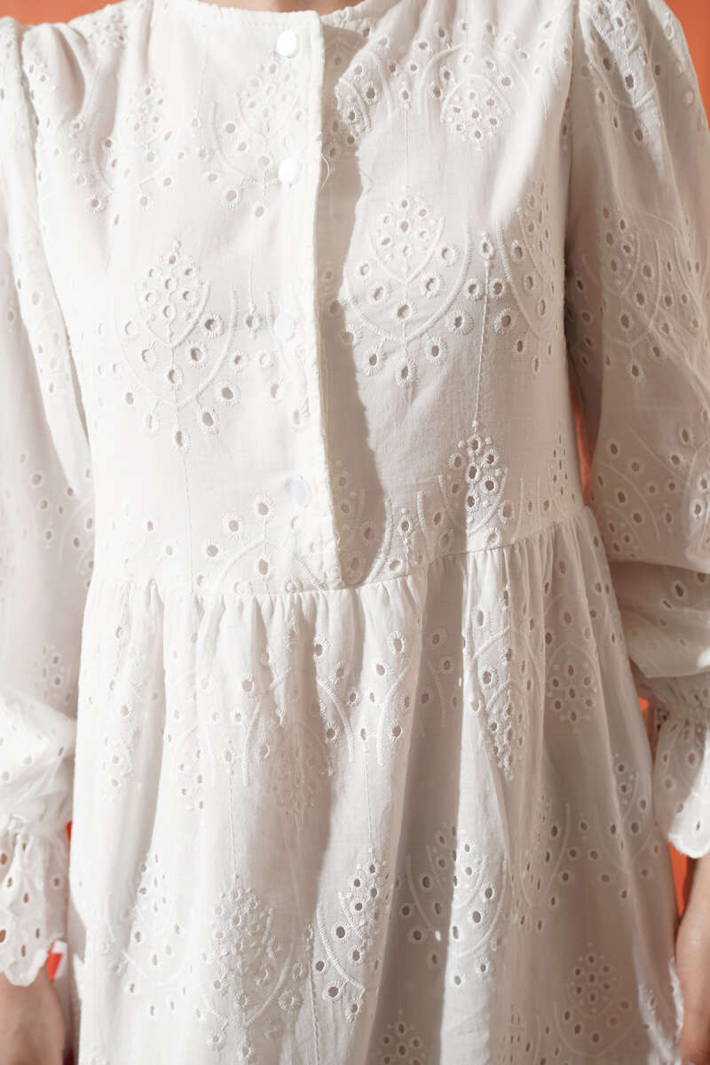 Düğmeli Brode Bilek Lastikli Elbise Beyaz