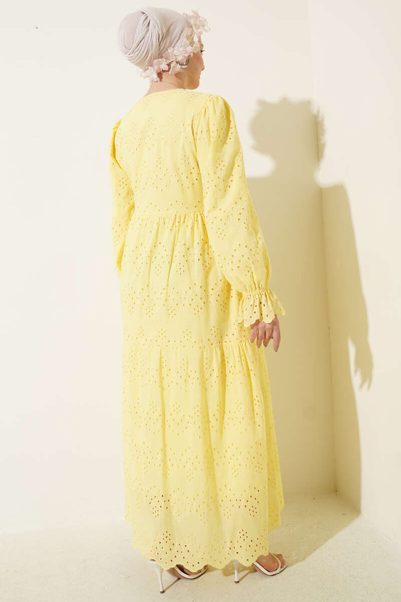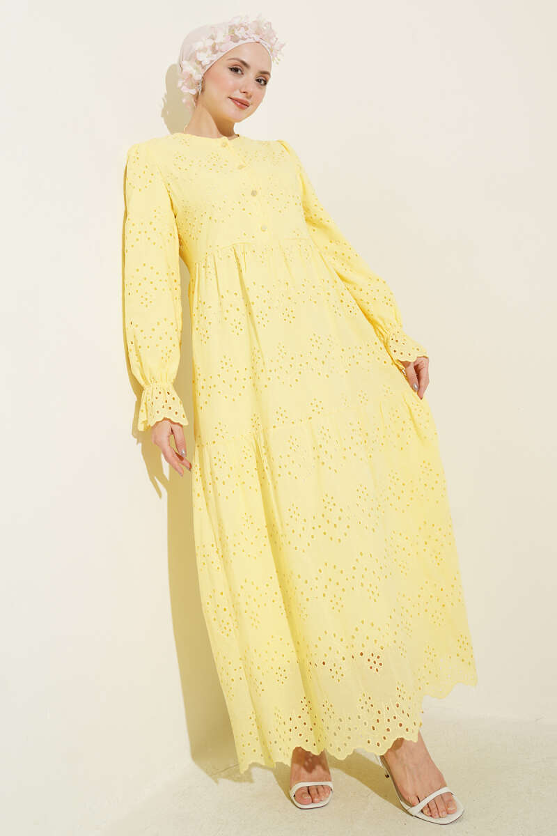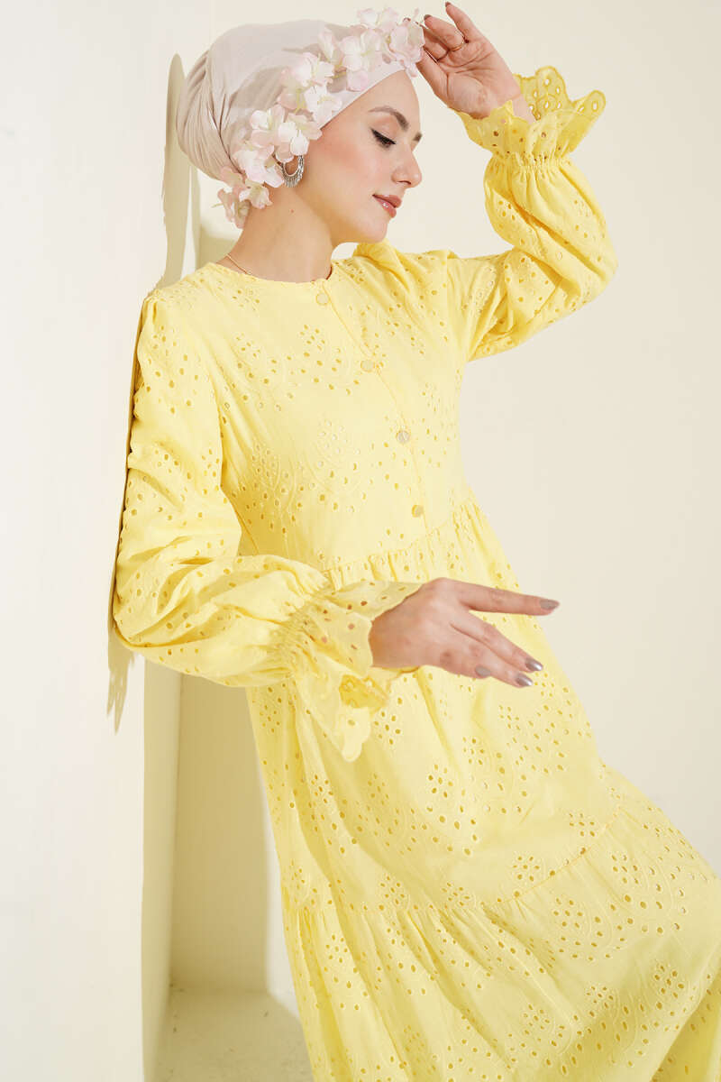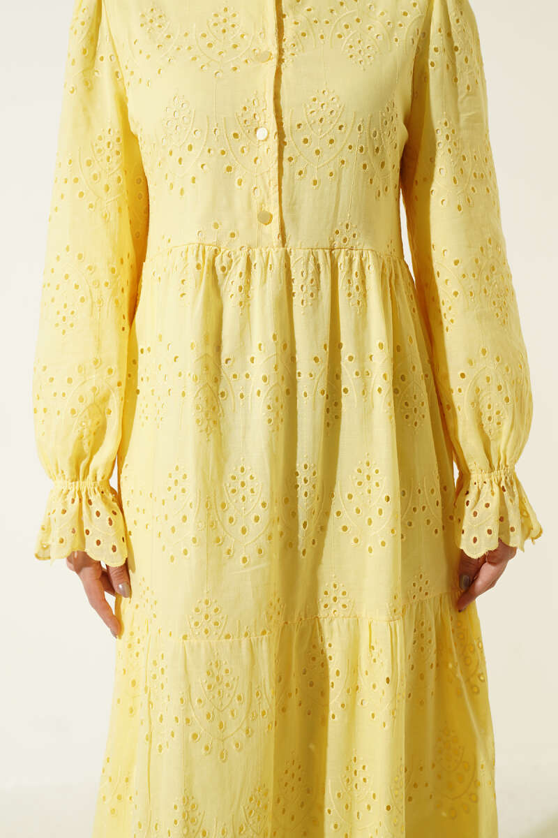 Düğmeli Brode Bilek Lastikli Elbise Sarı