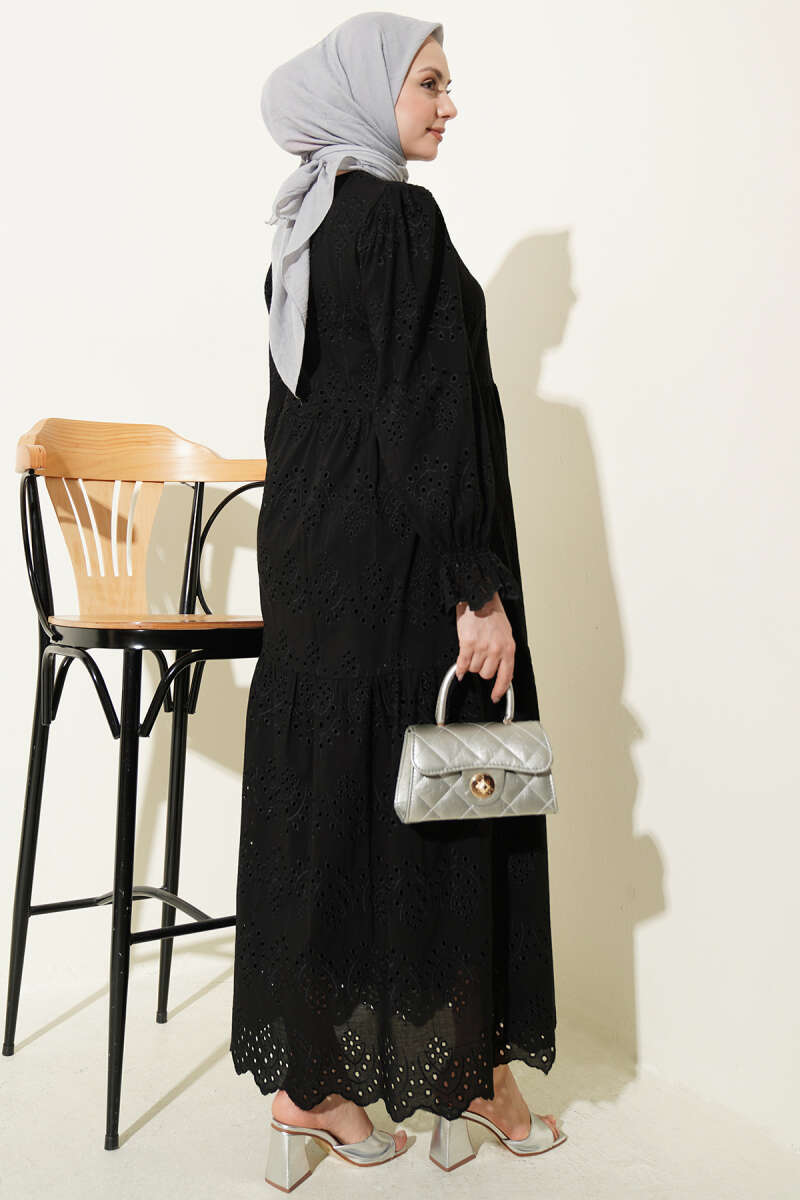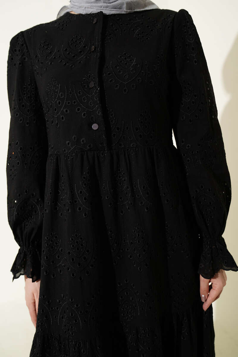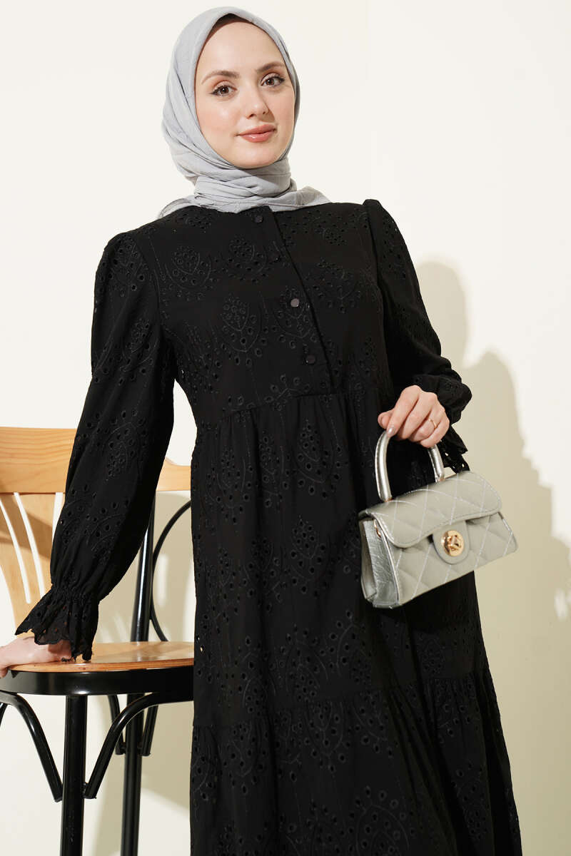 Düğmeli Brode Bilek Lastikli Elbise Siyah