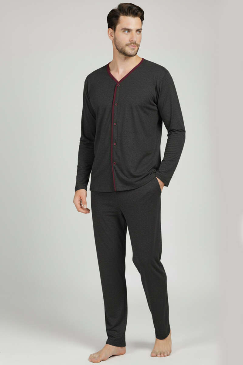 Düğmeli Büyük Beden İnterlok Erkek Pijama Takım Füme