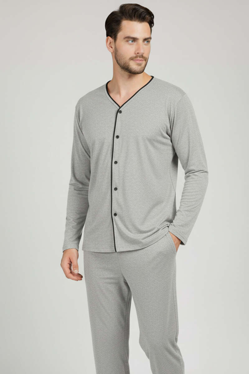 Düğmeli Büyük Beden İnterlok Erkek Pijama Takım Gri