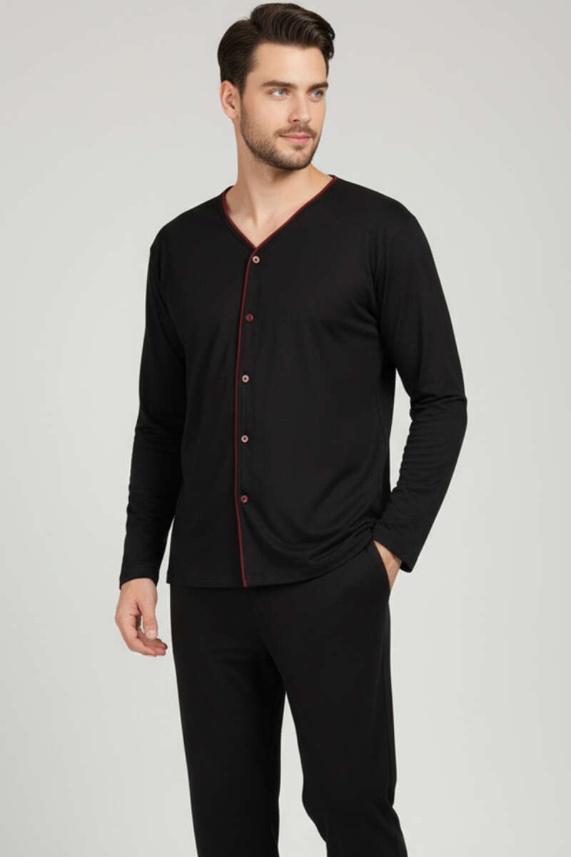 Düğmeli Büyük Beden İnterlok Erkek Pijama Takım Siyah
