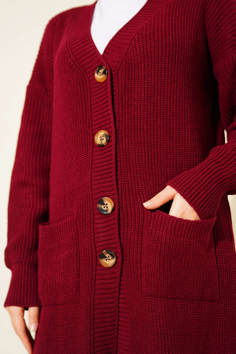 Düğmeli Cepli Uzun Triko Hırka Bordo