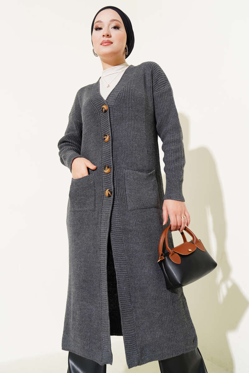 Düğmeli Cepli Uzun Triko Hırka Füme