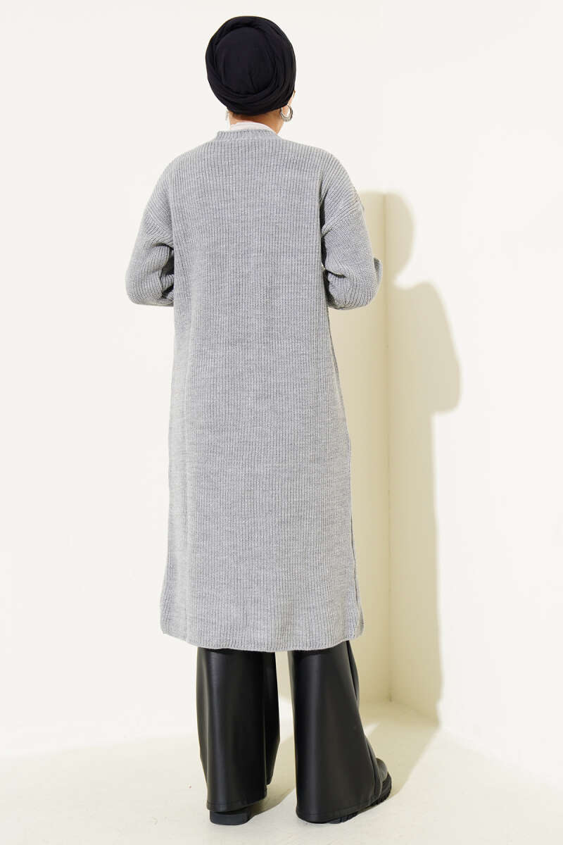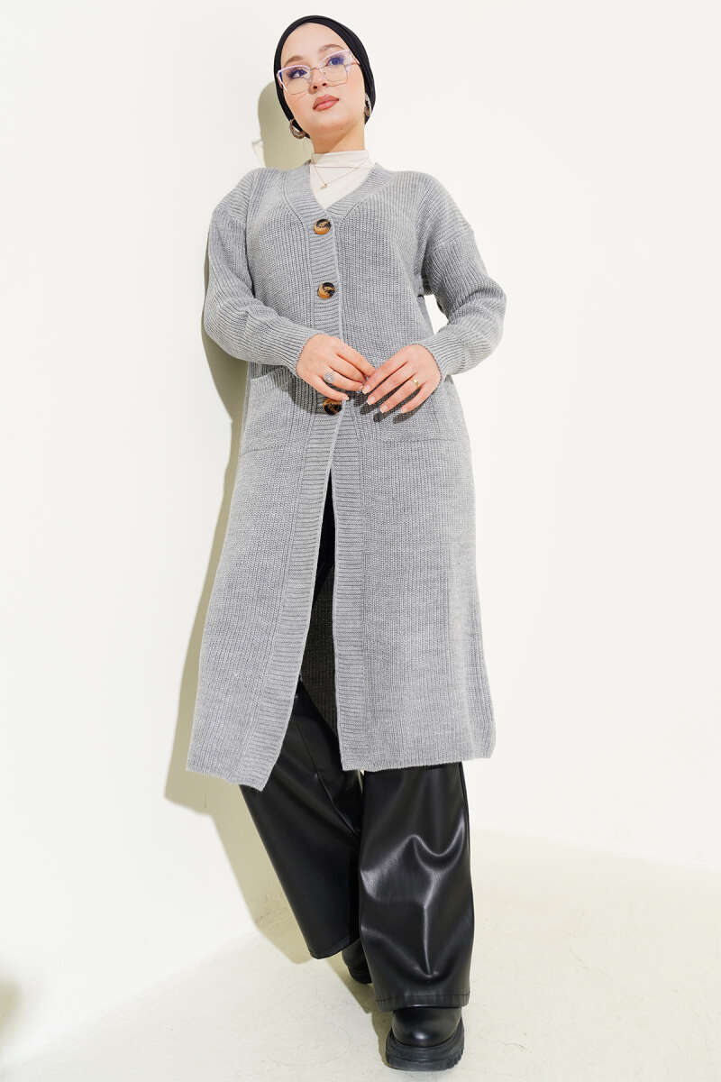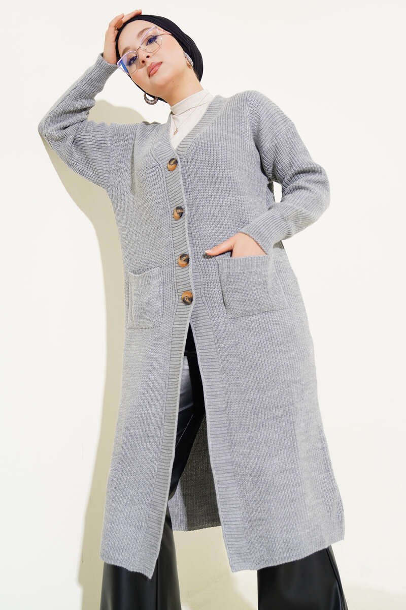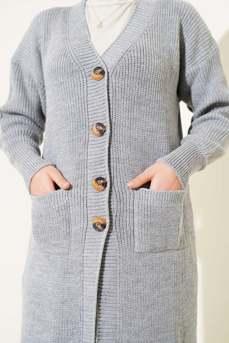 Düğmeli Cepli Uzun Triko Hırka Gri